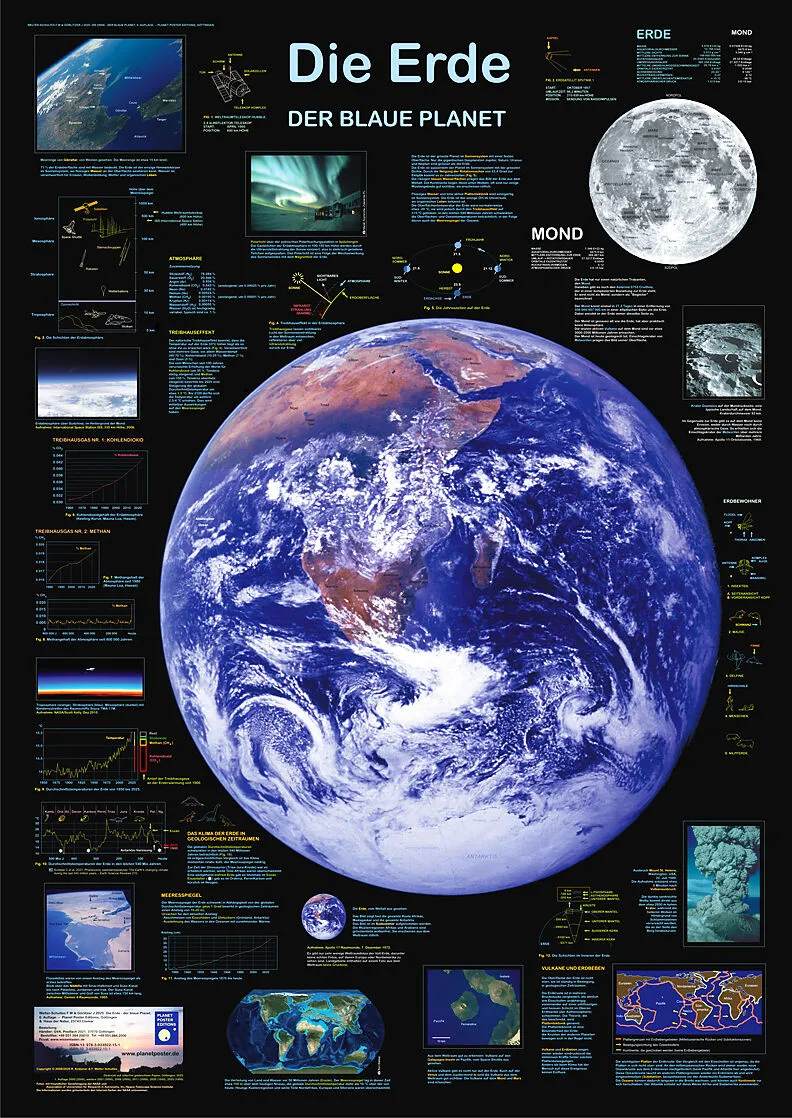 Die Erde vom Weltraum aus gesehen. Das Poster zeigt neben der vielleicht schönsten Weltall-Aufnahme der Erde auch Satellitenaufnahmen und Detailaufnahmen unseres Planeten von Raumsonden. Das Hauptmotiv wurde im Südsommer 1972 von der Crew der Raumsonde Apollo ...
