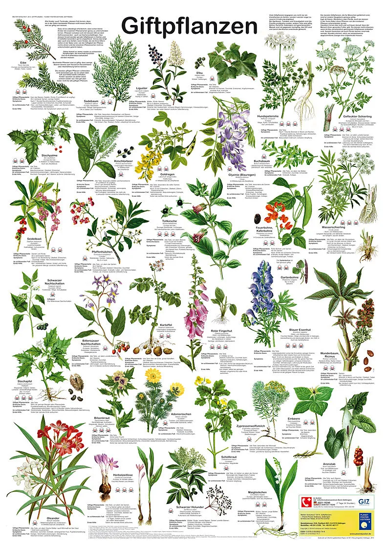 Das Poster Giftpflanzen entstand 2014 und zeigt 33 der giftigsten Pflanzen, die in Mitteleuropa in der Natur wachsen oder als Zierpflanzen eingebürgert wurden. Alle Kinder, auch Tierkinder, müssen früh lernen, dass sie in der Natur bestimmte Pflanzen nicht ess...