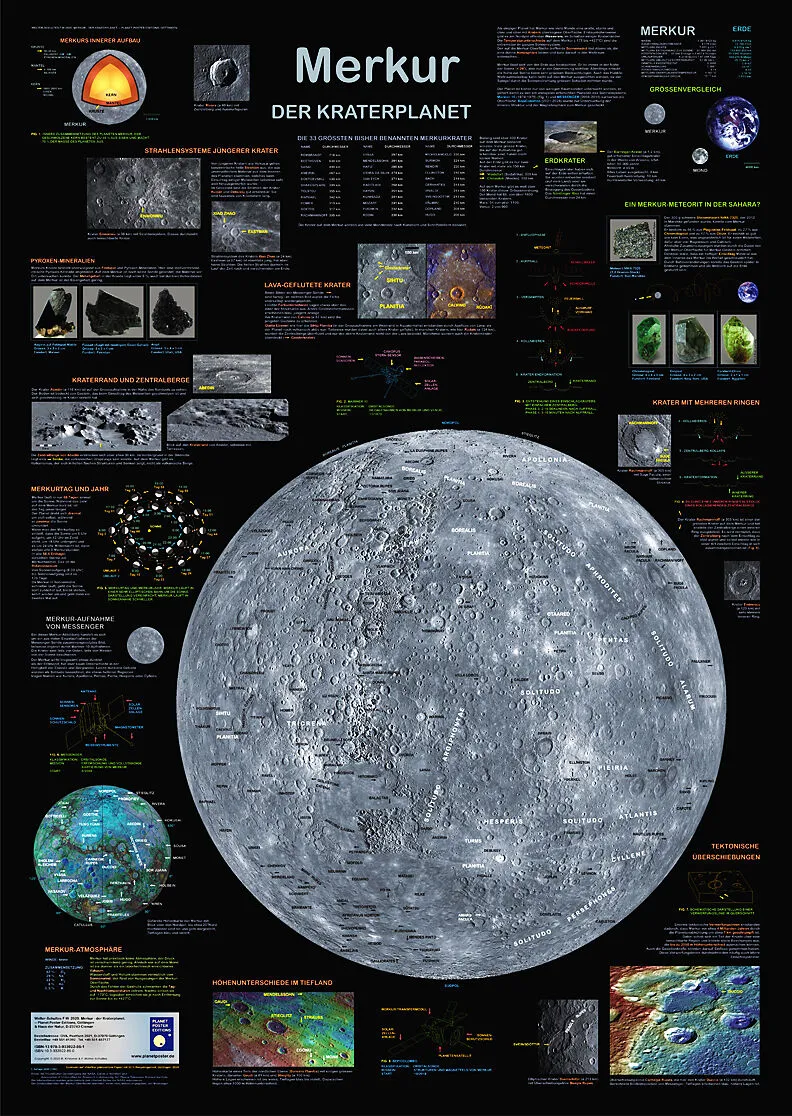 Als einziger Planet hat Merkur wie viele Monde eine uralte, starre und über und über mit Kratern überzogene Oberfläche. Erstaunlicherweise gibt es am Nordpol offenbar Wassereis, im Schatten einiger Kraterränder. Die Temperaturunterschiede auf dem Merkur (-173 ...