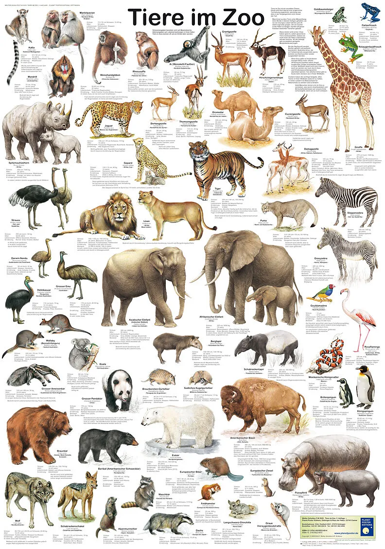 Unser 2009 entstandenes Poster Tiere im Zoo zeigt die etwa 60 bedeutendsten Tiere, die in mitteleuropäischen Zoos bewundert werden können. Jedes Tier ist mit seinem deutschen und wissenschaftlichen Namen aufgeführt, Verbreitung, Grösse, Alter, Lebensraum, Nahr...