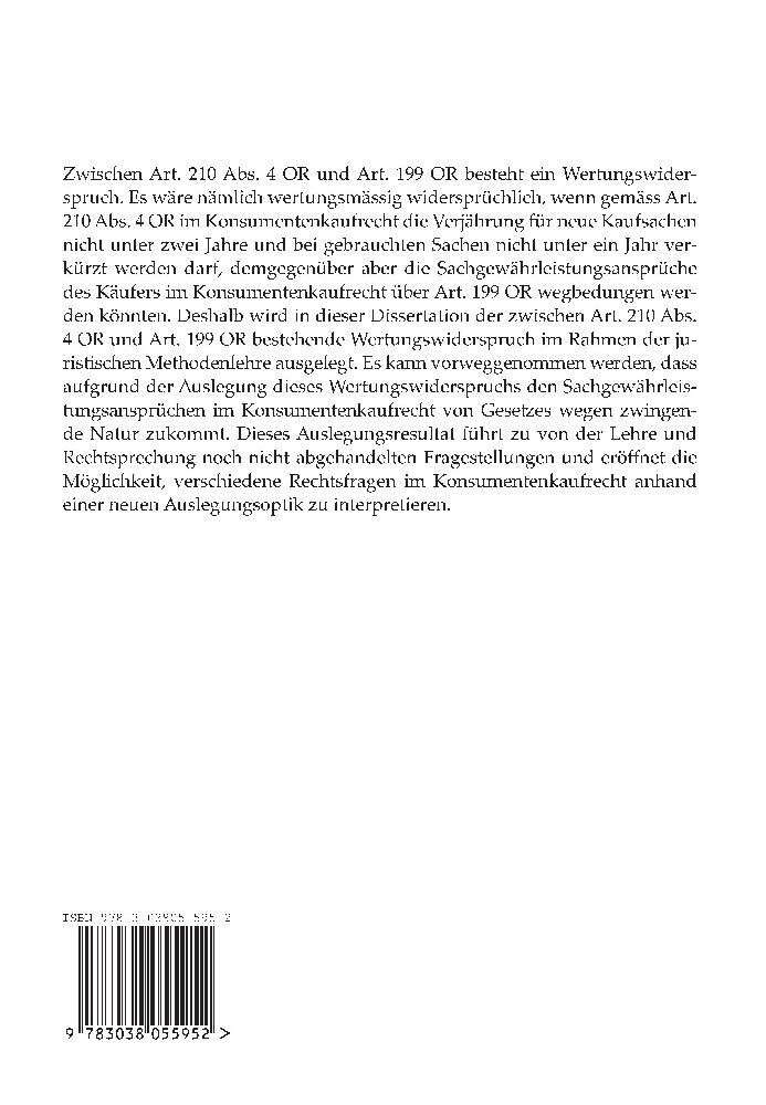 Zwischen Art. 210 Abs. 4 OR und Art. 199 OR besteht ein Wertungswiderspruch. Es wäre nämlich wertungsmässig widersprüchlich, wenn gemäss Art. 210 Abs. 4 OR im Konsumentenkaufrecht die Verjährung für neue Kaufsachen nicht unter zwei Jahre und bei gebrauchten Sa...