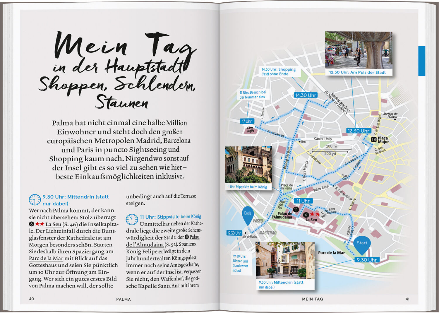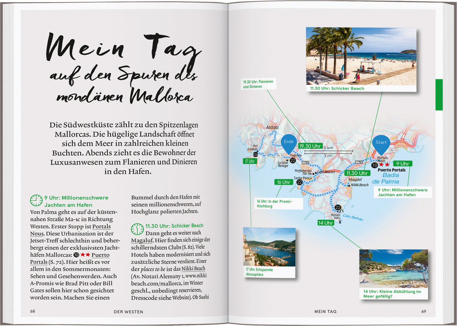 Als wenn er genau wüsste, was Ihnen gefällt planen Sie morgens schnell und einfach den Tag mit dem Baedeker SMART Mallorca Reiseführer. Starten Sie doch gleich in der Früh mit einem Rundgang durch die Hauptstadt Palma de Mallorca. Hier warten Sehenswürdigkeiten wie die beeindruckende Kathedrale La Seu, der reizvolle Stadthafen Puerto de Palma oder die Festung Castell de Bellver auf Sie. Vielleicht steht Ihnen der Sinn aber eher nach Städte-Hopping dann sollten Sie auf Ihrer Rundreise durch Mallorca unbedingt Cala Ratjada, Sineu und Valldemossa besuchen. Oder haben Sie Lust, sich von der mysteriösen Unterwelt der Drachenhöhlen Coves del Drac verzaubern zu lassen? Neben allen klassischen Sehenswürdigkeiten halten wir Tipps für ganz besondere Urlaubstage für Sie bereit. Beispielsweise können Sie beim selbst mitgebrachten Picknick auf der Aussichtsplattform Mirador de la Victòria bei Alcudia einen der schönsten Sonnenuntergänge Mallorcas genießen. Mit unseren inspirierenden Ideen sorgen wir für eine entspannte Urlaubsplanung und machen Ihren Mallorca-Urlaub zum einmaligen Erlebnis.