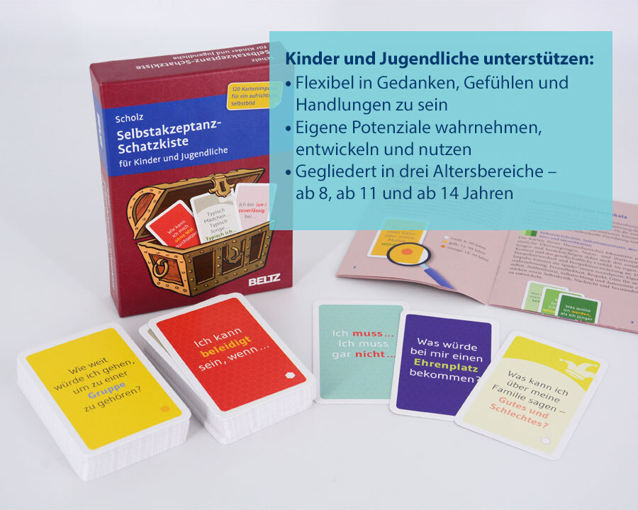 Selbstakzeptanz ist Grundlage psychischer Gesundheit und ermöglicht es Kindern und Jugendlichen, flexibler in Gedanken, Gefühlen und Handlungen zu sein. Das Kartenset für die psychologische und pädagogische Praxis lädt spielerisch dazu ein, ein realistisches B...