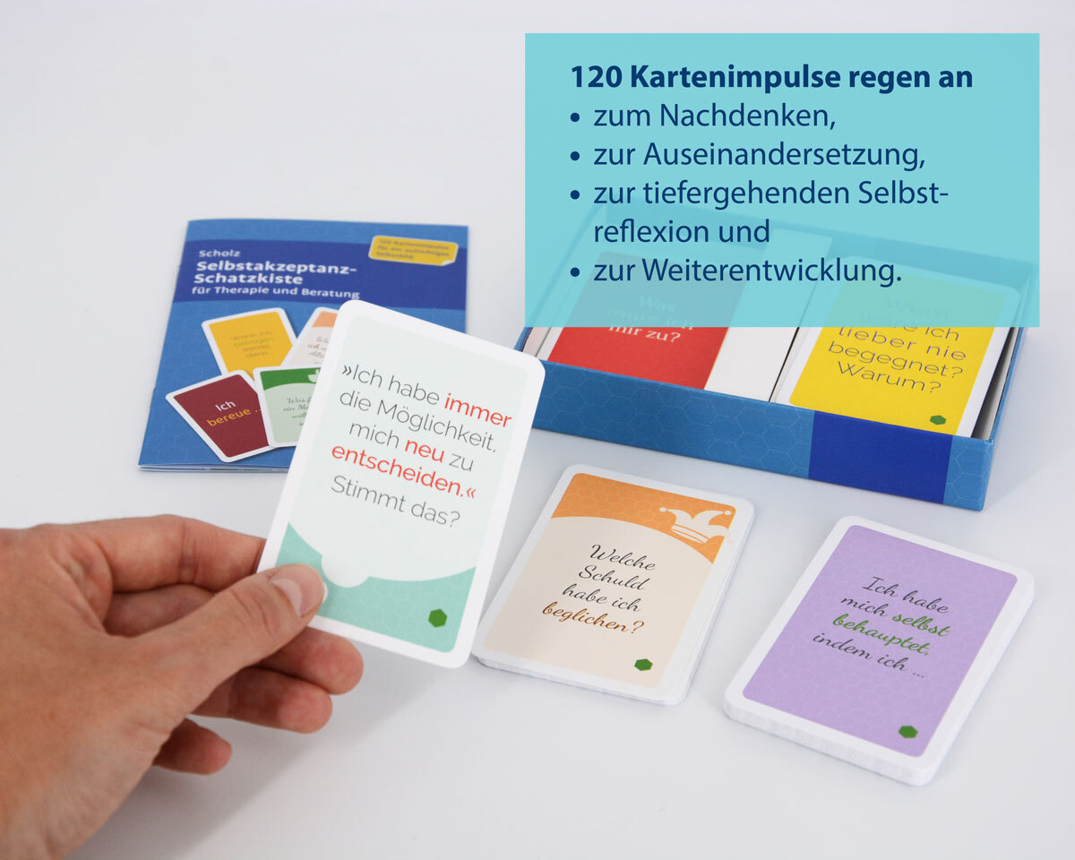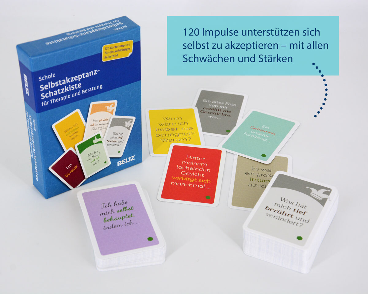 Ein akzeptierender, liebevoller Umgang mit sich selbst fördert das Wohlbefinden und ist ein Schutzschild gegen psychische Belastungen. Dieses Kartenset lädt spielerisch dazu ein, sich in Ganzheit, Unvollkommenheit und Widersprüchlichkeit anzunehmen. 120 Karten...