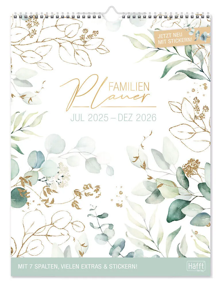 Extra großer Familienplaner mit sieben Spalten für 18 Monate im Design [Blattgold], Wandkalender mit Wire-O und Aufhänger, immer ein Monat pro Blatt, Laufzeit Juli 2025 bis Dezember 2026, mit Feiertagen und Schulferienterminen, Stundenplänen für alle, einer Ja...