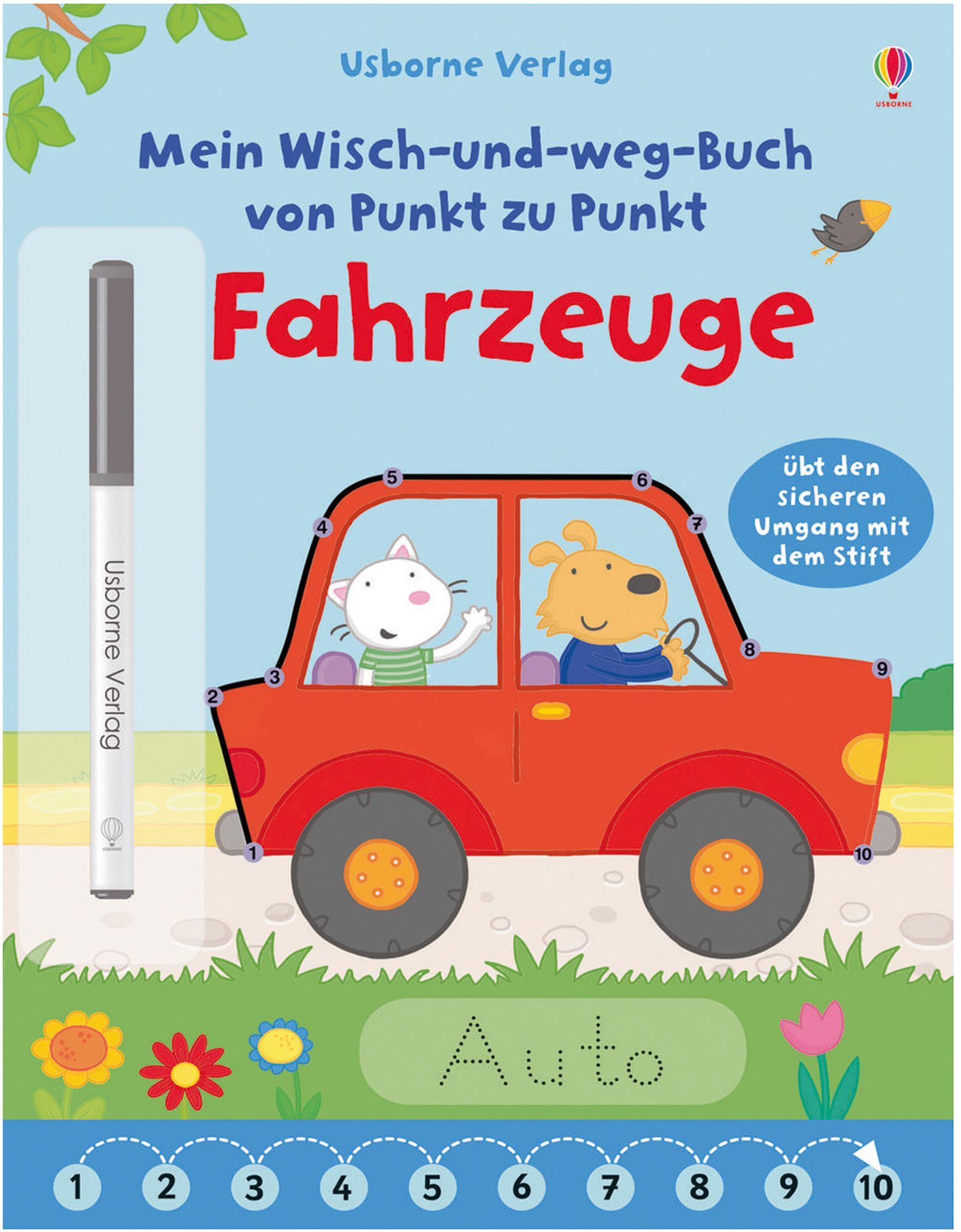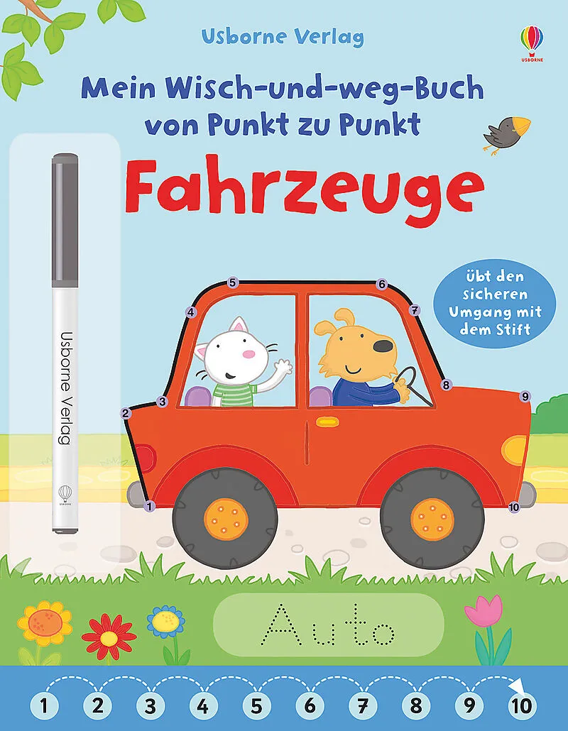 Was ist auf dem Bild zu sehen? Verbinde alle gleichfarbigen Punkte der Reihe nach und fahre die Namen unter dem Bild nach. So übst du das Zählen und den sicheren Umgang mit dem Stift! Und falls etwas danebengeht: einfach wegwischen und von vorn beginnen.