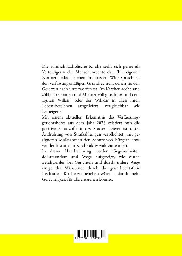 Die römisch-katholische Kirche stellt sich gerne als Verteidigerin der Menschenrechte dar. Ihre eigenen Normen jedoch stehen im krassen Widerspruch zu den verfassungsmäßigen Grundrechten, denen sie den Gesetzen nach unterworfen ist. Im Kirchenrecht sind zöliba...