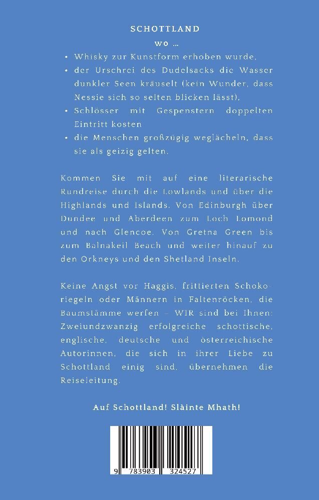 Britische und deutsche Autorinnen schreiben Kurzgeschichten über Schottland SCHOTTLAND wo Whisky zur Kunstform erhoben wurde, der Urschrei des Dudelsacks die Wasser dunkler Seen kräuselt (kein Wunder, dass Nessie sich so selten blicken lässt), Schlösser mit Ge...