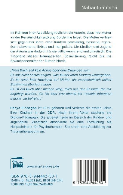 Im Rahmen ihrer Ausbildung realisiert die Autorin, dass ihre Mutter an der Persönlichkeitsstörung Borderline leidet. Die Mutter verhielt sich gegenüber ihren zehn Kindern gewalttätig, hassend, egoistisch, abwertend, lieblos und manipulativ. Die Kindheit und Ju...