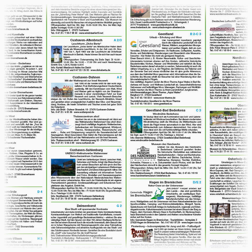 Als Ferienland präsentiert sich das Gebiet zwischen Weser und Elbe: Es bietet zahlreiche Attraktionen wie das Deutsche Auswandererhaus, das Schifffahrtsmuseum in Bremerhaven, das Überseemuseum in Bremen oder das Wrackmuseum in Cuxhaven. Mit vielen Spaßbädern u...