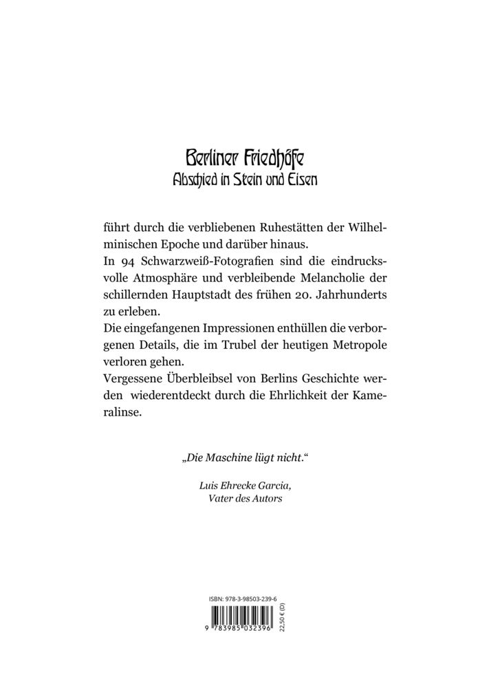 Berliner Friedhöfe-Abschied in Stein und Eisen führt durch die verbliebenen Ruhestätten der Wilhelminischen Epoche und darüber hinaus. In 94 Schwarzweiß-Fotografien sind die eindrucksvolle Atmosphäre und verbleibende Melancholie der schillernden Hauptstadt des...