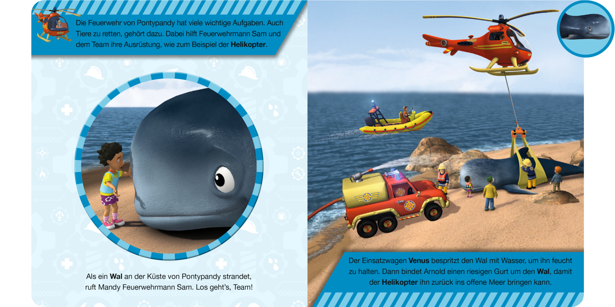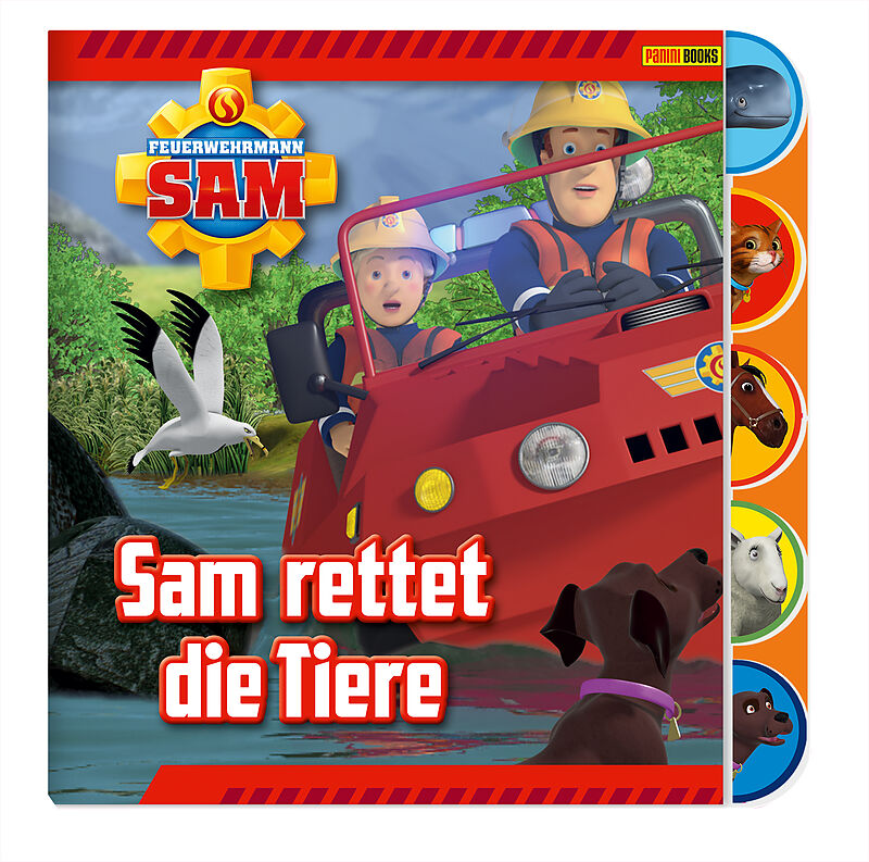 Neuer Einsatz für Feuerwehrmann Sam! Dieses Mal retten Sam und sein Team allerlei Tiere: einen Hund, eine Katze, ein Pferd und sogar einen gestrandeten Wal. Bei den Rettungsaktionen kommen alle Fahrzeuge der Feuerwache zum Einsatz. Das stabile Pappbilderbuch m...