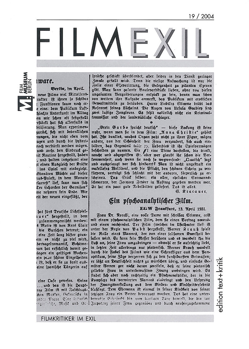 Im Mittelpunkt des Heftes stehen drei Beiträge über den Filmpublizisten und -theoretiker Siegfried Kracauer, bis zu seiner Emigration Kritiker der "Frankfurter Zeitung". Johannes Riedner zeichnet Kracauers "Flucht in den Film" nach - eine biografische Recherch...