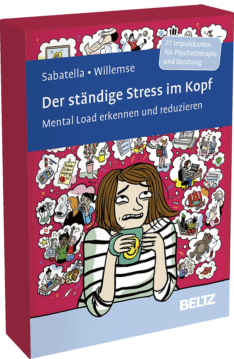 Strategien, um Mental Load zu reduzieren • Die persönlichen Quellen mentaler Belastung identifizieren • Strategien entwickeln, um den Stress im Kopf zu reduzieren • 77 Impulskarten mit Bild und Text Wir planen konstant: morgens, mittags, nachts,...Strategien, um Mental Load zu reduzieren • Die persönlichen Quellen mentaler Belastung identifizieren • Strategien entwickeln, um den Stress im Kopf zu reduzieren • 77 Impulskarten mit Bild und Text Wir planen konstant: morgens, mittags, nachts, Einkaufsliste, zu kleine Gummistiefel, Fußballtraining, den eigenen Vater nicht vergessen, der Bericht muss noch fertiggeschrieben werden, Essen auf den Tisch alles dreht sich im Kopf. Und hinter diesem Tagesprogramm steckt ein noch größeres Denkgeflecht: Die Notwendigkeit der Aufgaben muss erkannt, Umsetzungsschritte geplant, Optionen abgewogen, Prioritäten gesetzt und Entscheidungen getroffen werden. Das alles ist Denkarbeit, »Mental Load«. Wird die Belastung zu groß, kann dies vielfältige Folgen haben, gesundheitlich, aber auch sozial. In Psychotherapie und Beratung taucht das Thema häufig erst auf, wenn neben den reinen Stressgefühlen auch Depressionen, Burn-out, Angststörungen sichtbar werden. Das Kartenset erleichtert die Arbeit mit einem nicht immer greifbaren Thema: Die Karten stellen einerseits Belastungssituationen dar, andererseits aber auch Ressourcen und Strategien zur Bewältigung. Die gezeigten Beispiele sind breit angelegt, sie beziehen sich auf Kindererziehung und Familienarbeit, aber auch auf die Pflege kranker Angehöriger und sonstige Stresssituationen. Das Booklet schlägt verschiedene Anwendungsvarianten vor. Mental Load lässt sich reduzieren • Für alle, die viel Denkarbeit leisten, u.a. Eltern, erwachsene Kinder, pflegende Angehörige • Anwendungsvarianten im Booklet Aus dem Inhalt: Modul 1 Ich (z.B. Selbstfürsorge, Eigene körperliche Befindlichkeit) • Modul 2 Konkrete Aufgaben (z.B. Putzen, Einkaufen, Kinder ins Bett bringen) • Modul 3 Management-Denken (z.B. Zeitmanagement, Notfallpläne, Finanzen) • Modul 4 Metaparenting (z.B. Konsum, Erscheinungsbild) • Modul 5 Emotional Load (z.B. Erwartungen aller erfüllen, Sorge um Gesundheit der Liebsten) • Modul 6 Darf es noch etwas mehr sein? (z.B. Unterschiedliche Familienkonstellationen) • Modul 7 Strategien (z.B. Ritualisieren, Aufteilen statt Delegieren)