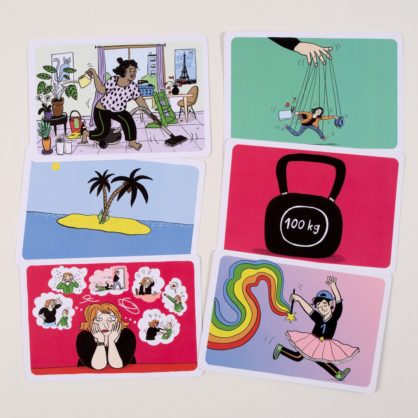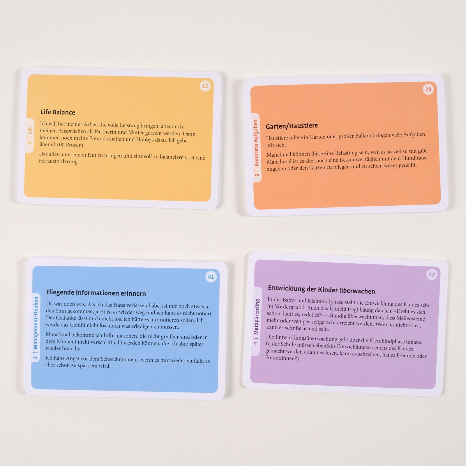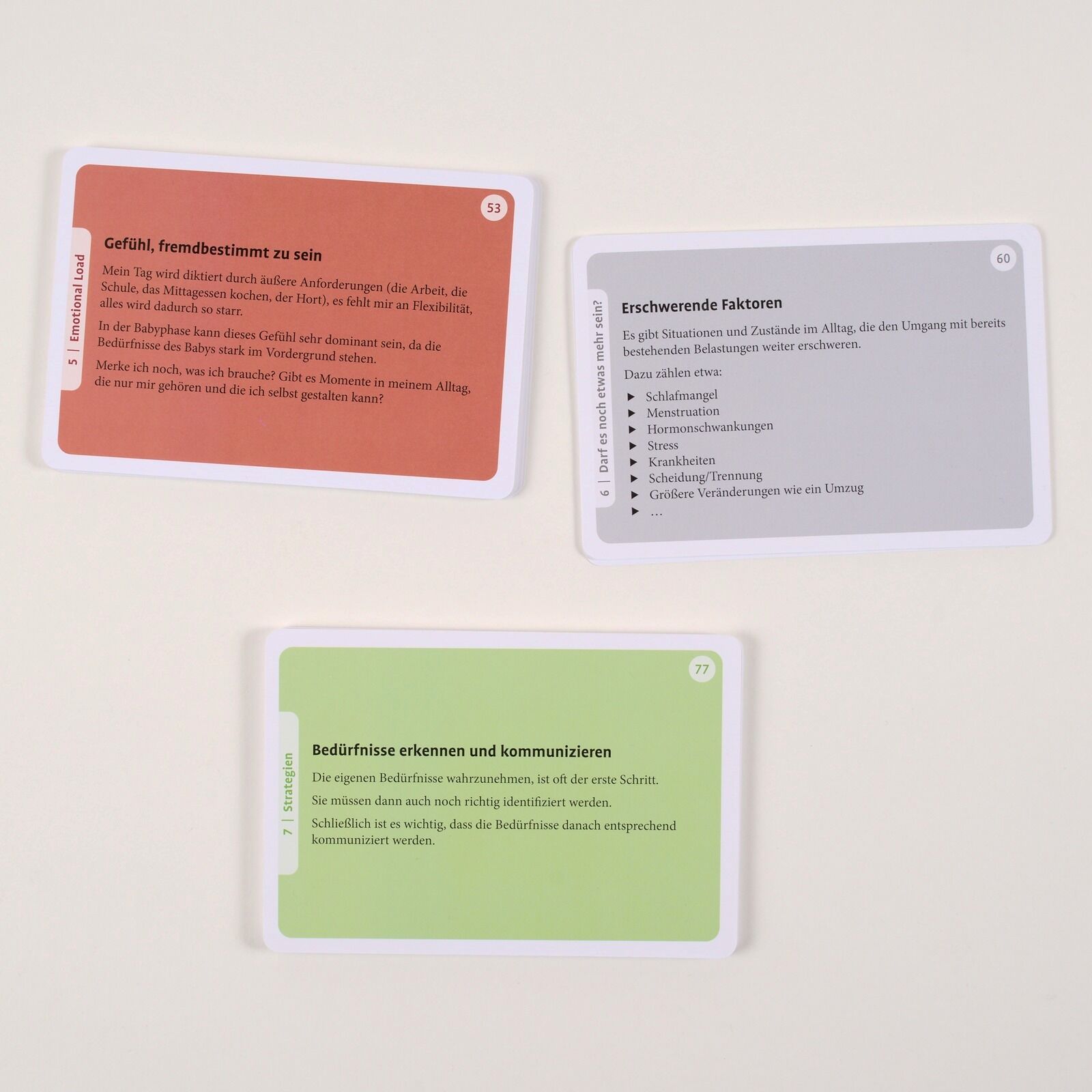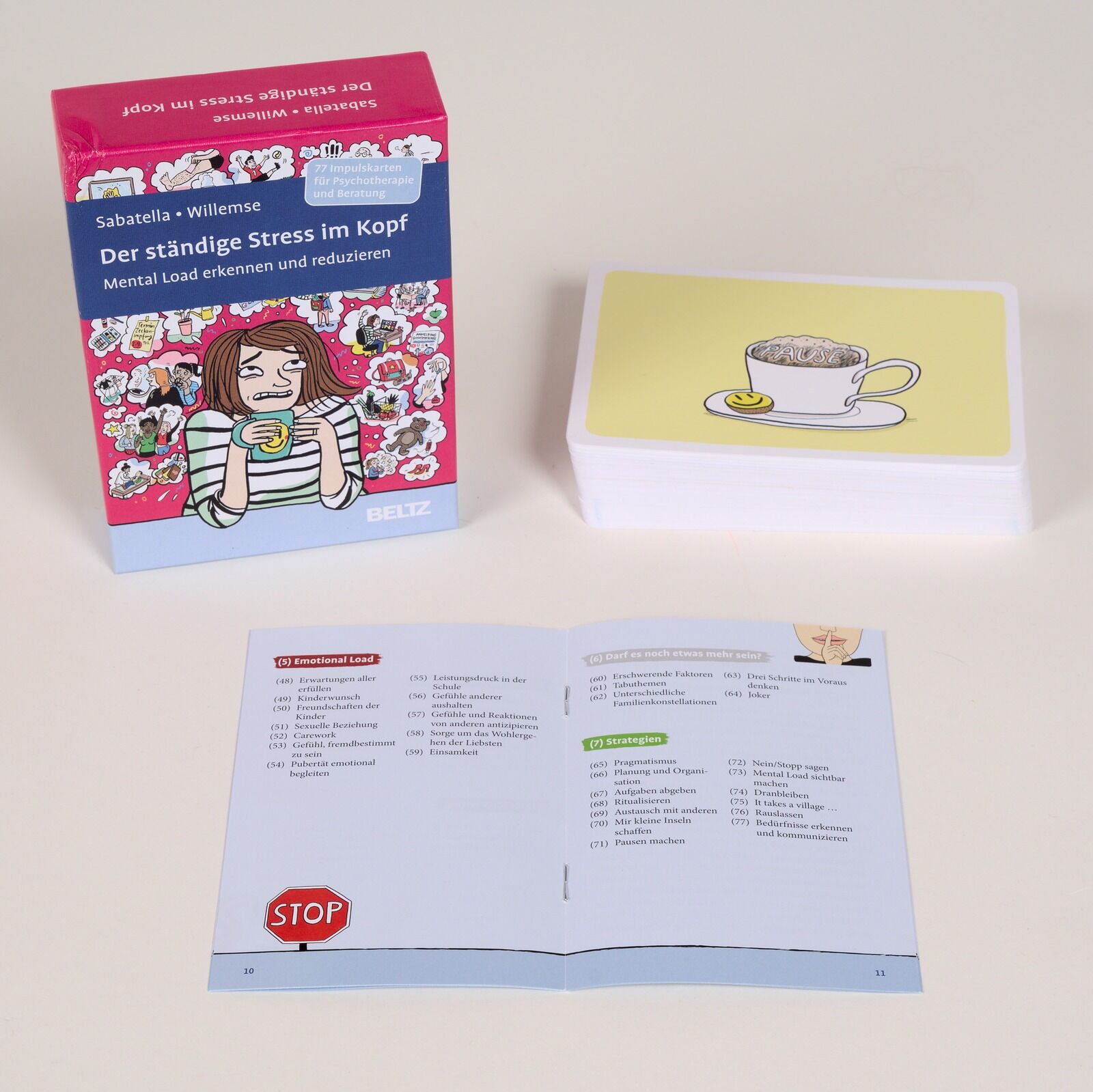 Strategien, um Mental Load zu reduzieren • Die persönlichen Quellen mentaler Belastung identifizieren • Strategien entwickeln, um den Stress im Kopf zu reduzieren • 77 Impulskarten mit Bild und Text Wir planen konstant: morgens, mittags, nachts,...Strategien, um Mental Load zu reduzieren • Die persönlichen Quellen mentaler Belastung identifizieren • Strategien entwickeln, um den Stress im Kopf zu reduzieren • 77 Impulskarten mit Bild und Text Wir planen konstant: morgens, mittags, nachts, Einkaufsliste, zu kleine Gummistiefel, Fußballtraining, den eigenen Vater nicht vergessen, der Bericht muss noch fertiggeschrieben werden, Essen auf den Tisch alles dreht sich im Kopf. Und hinter diesem Tagesprogramm steckt ein noch größeres Denkgeflecht: Die Notwendigkeit der Aufgaben muss erkannt, Umsetzungsschritte geplant, Optionen abgewogen, Prioritäten gesetzt und Entscheidungen getroffen werden. Das alles ist Denkarbeit, »Mental Load«. Wird die Belastung zu groß, kann dies vielfältige Folgen haben, gesundheitlich, aber auch sozial. In Psychotherapie und Beratung taucht das Thema häufig erst auf, wenn neben den reinen Stressgefühlen auch Depressionen, Burn-out, Angststörungen sichtbar werden. Das Kartenset erleichtert die Arbeit mit einem nicht immer greifbaren Thema: Die Karten stellen einerseits Belastungssituationen dar, andererseits aber auch Ressourcen und Strategien zur Bewältigung. Die gezeigten Beispiele sind breit angelegt, sie beziehen sich auf Kindererziehung und Familienarbeit, aber auch auf die Pflege kranker Angehöriger und sonstige Stresssituationen. Das Booklet schlägt verschiedene Anwendungsvarianten vor. Mental Load lässt sich reduzieren • Für alle, die viel Denkarbeit leisten, u.a. Eltern, erwachsene Kinder, pflegende Angehörige • Anwendungsvarianten im Booklet Aus dem Inhalt: Modul 1 Ich (z.B. Selbstfürsorge, Eigene körperliche Befindlichkeit) • Modul 2 Konkrete Aufgaben (z.B. Putzen, Einkaufen, Kinder ins Bett bringen) • Modul 3 Management-Denken (z.B. Zeitmanagement, Notfallpläne, Finanzen) • Modul 4 Metaparenting (z.B. Konsum, Erscheinungsbild) • Modul 5 Emotional Load (z.B. Erwartungen aller erfüllen, Sorge um Gesundheit der Liebsten) • Modul 6 Darf es noch etwas mehr sein? (z.B. Unterschiedliche Familienkonstellationen) • Modul 7 Strategien (z.B. Ritualisieren, Aufteilen statt Delegieren)
