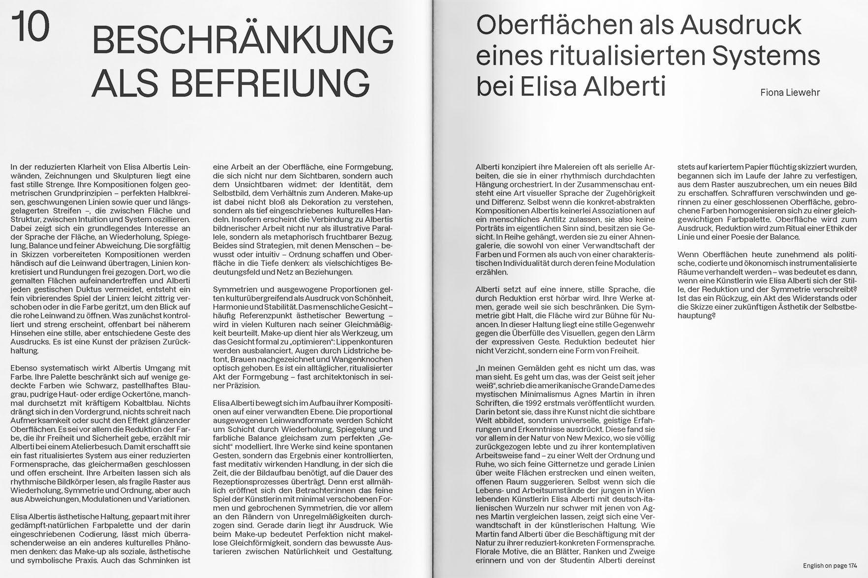 The publication by Elisa Alberti provides an overview of her artistic work from 2021 to early 2025. During this period, she presented her works at the Hamburger Kunsthalle, the Kunstmuseum Ahlen, in solo exhibitions, and at international art fairs. Her paintin...