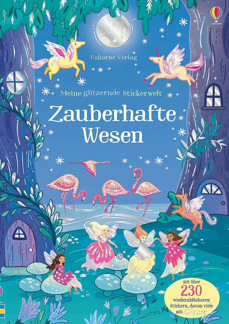 Tauche ein in die bunte Glitzerwelt voller Einhörner, Feen, Flamingos und festlich geschmückter Elefanten! Dekoriere die zauberhaften Wesen mit über 230 Stickern, davon über 100 mit Glitzer.