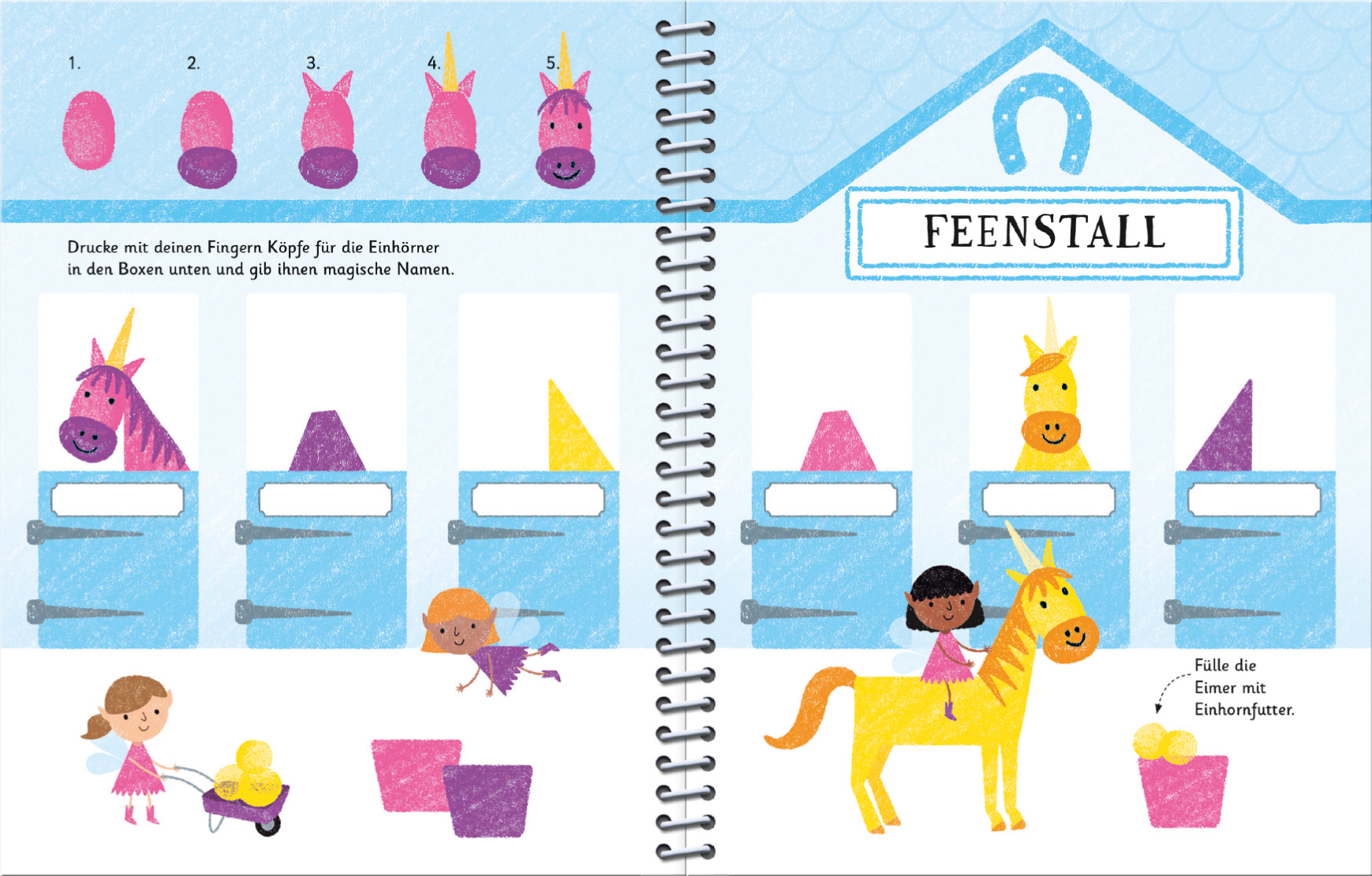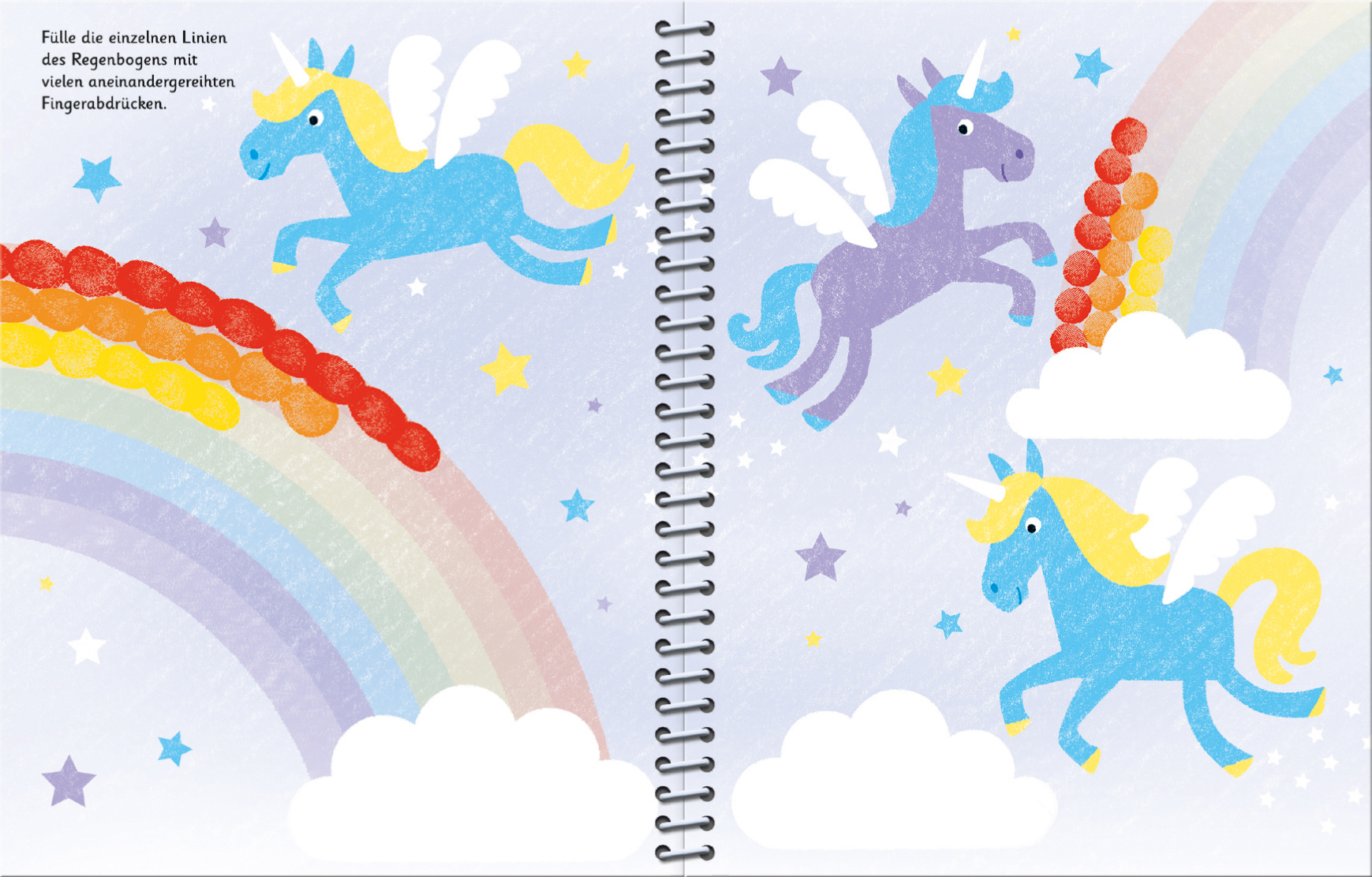 Mit 7 Stempelfarben, Schritt-für-Schritt-Anleitungen und jeder Menge Platz zum Stempeln und Malen. Ein Fingerabdruck hier, ein paar Striche dort schon galoppieren Einhörner über den Regenbogen und Feen schweben über Blumenwiesen. Mit sieben Stempelfarben, Sch...