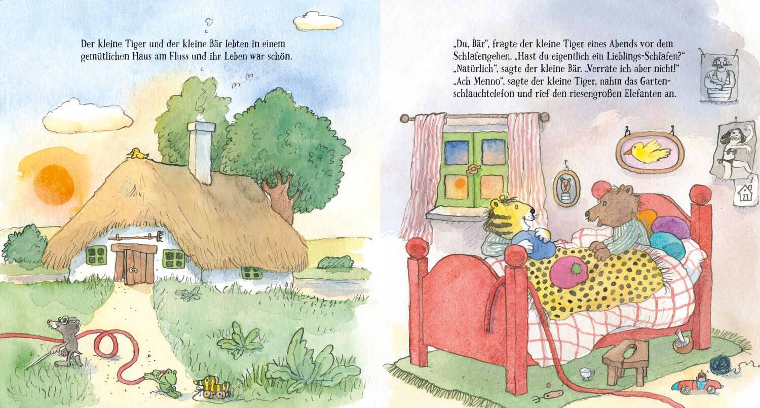 Du, Bär?, fragte der kleine Tiger eines Abends vor dem Schlafengehen. Hast du eigentlich ein Lieblings-Schlafen? Natürlich, sagte der kleine Bär. Verrate ich aber nicht! Menno, sagte der kleine Tiger und rief beim riesengroßen Elefanten an. Ob der wohl ein Lieblings-Schlafen hat? Und wie schläft Tante Gans am liebsten? Oder der müde Maulwurf? Schnapp dir zusammen mit dem kleinen Tiger das Gartentelefon und finde es heraus!