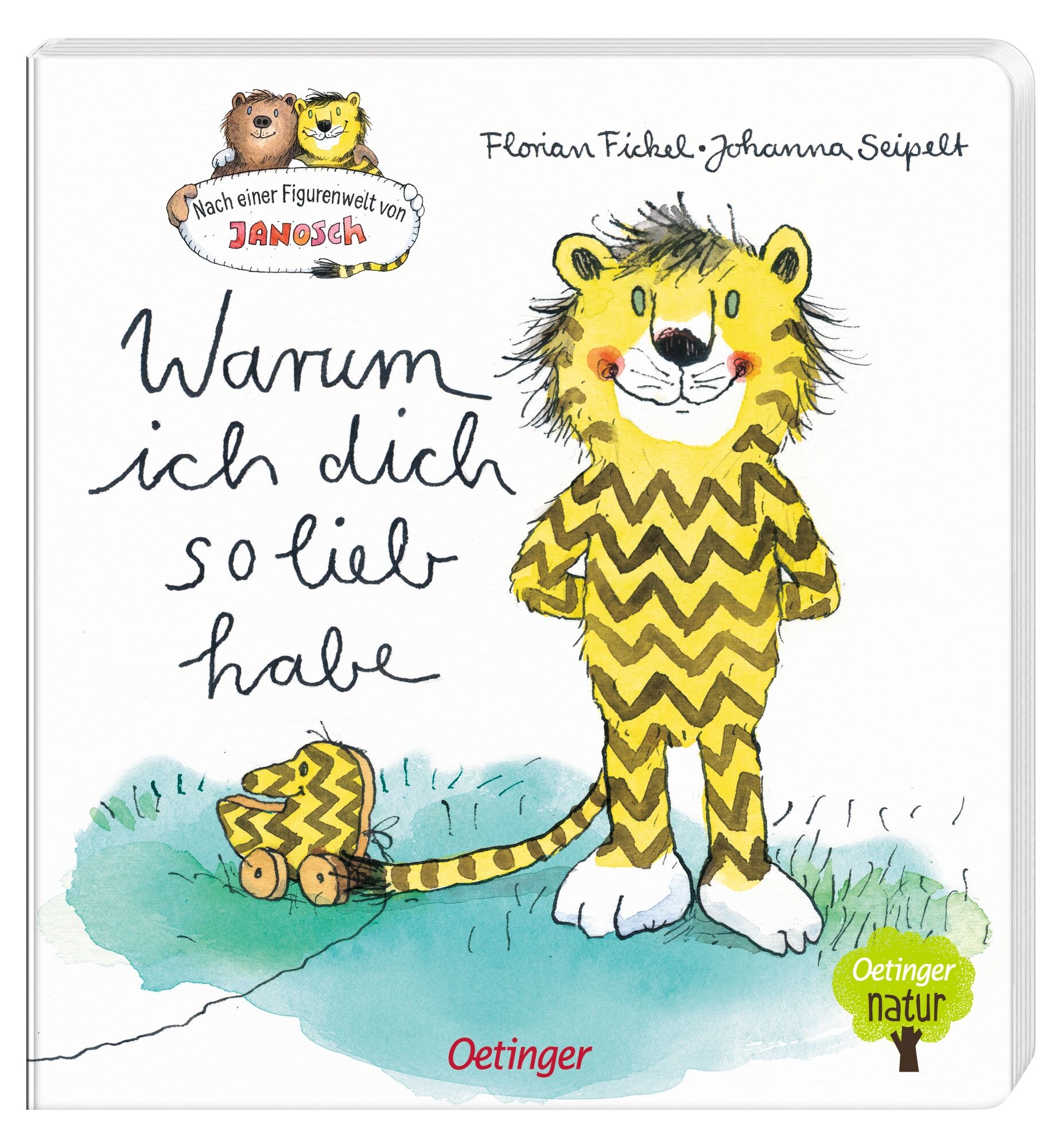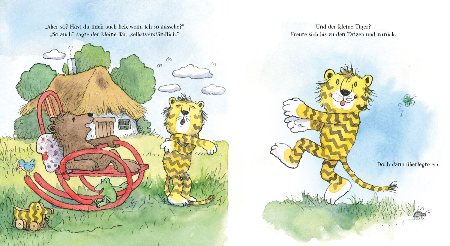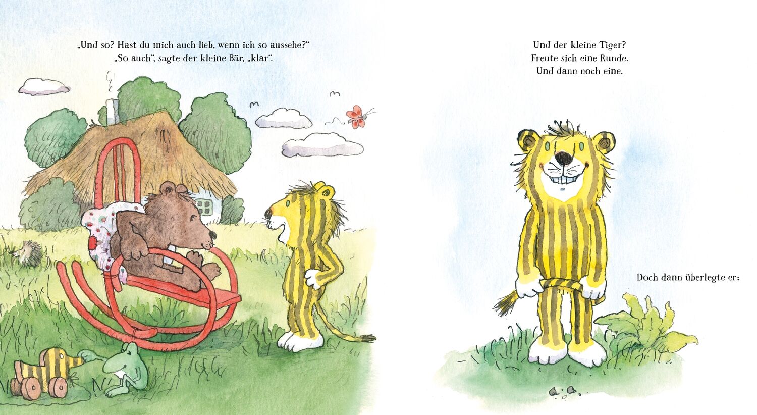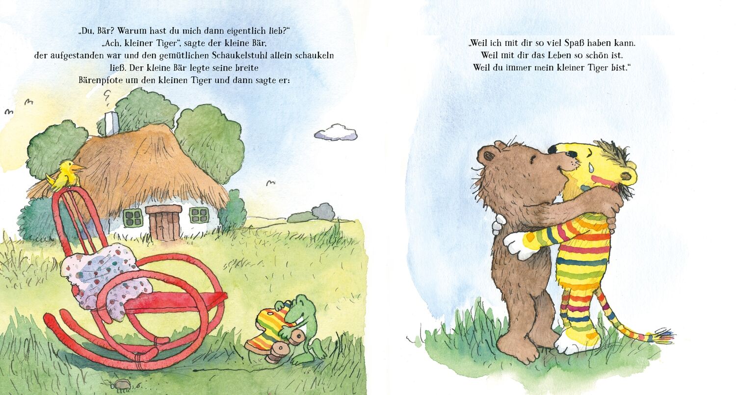 Oh, wie schön ist Liebhaben! Bär, hast du mich eigentlich lieb?, fragt der kleine Tiger. Natürlich!, antwortet der kleine Bär. Da fängt der kleine Tiger an, die Streifen in seinem Fell zu verändern: Von längs zu quer, in Zickzack und Pünktchen bis er schließl...