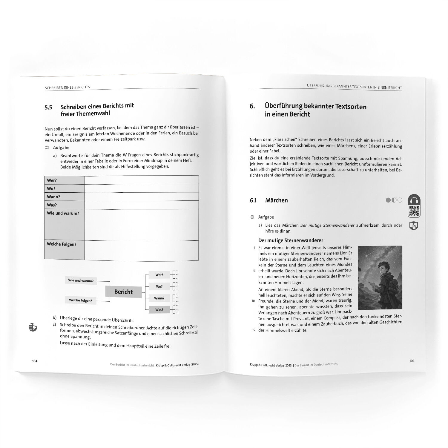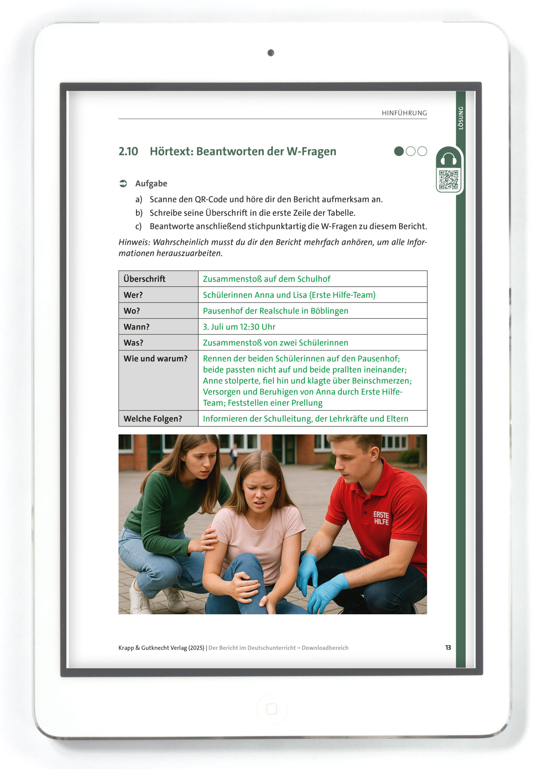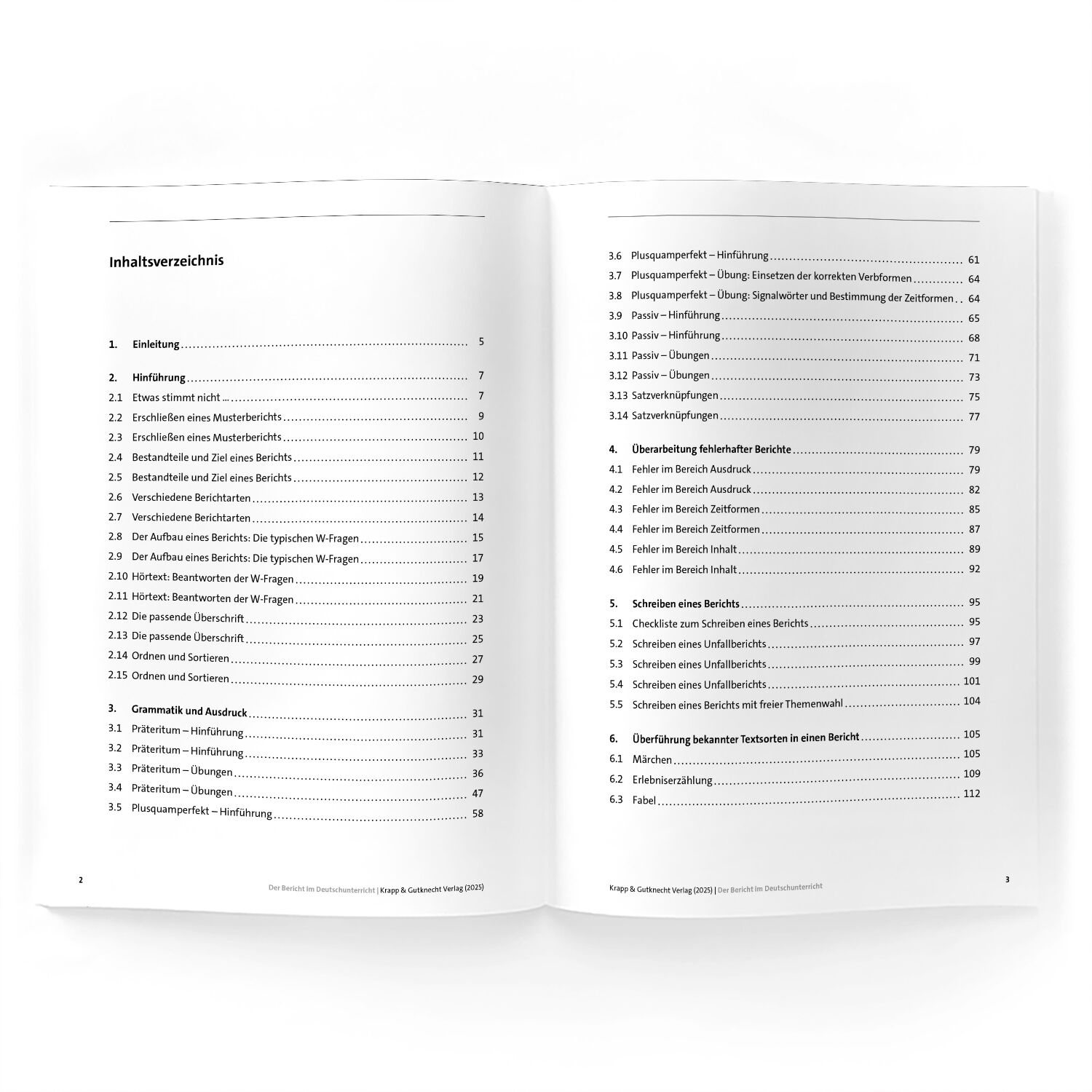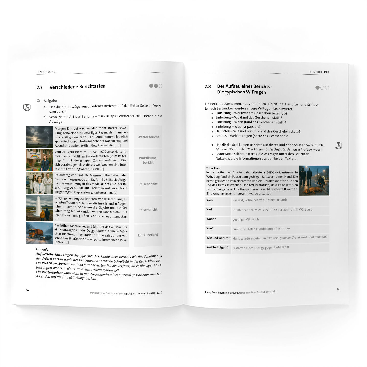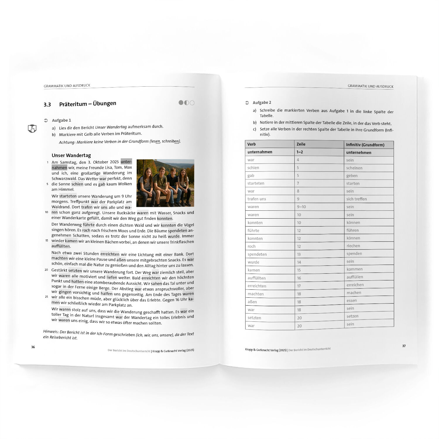 Das Lehrbuch deckt alle zentralen Aspekte des Berichtschreibens ab vom ersten Zugang über Textanalysen bis hin zum eigenständigen Schreiben . Dabei verbindet es funktionale Textsortenkompetenz mit relevanten grammatischen Themen (Präteritum, Plusquamperfekt, Passiv, Satzverknüpfungen).