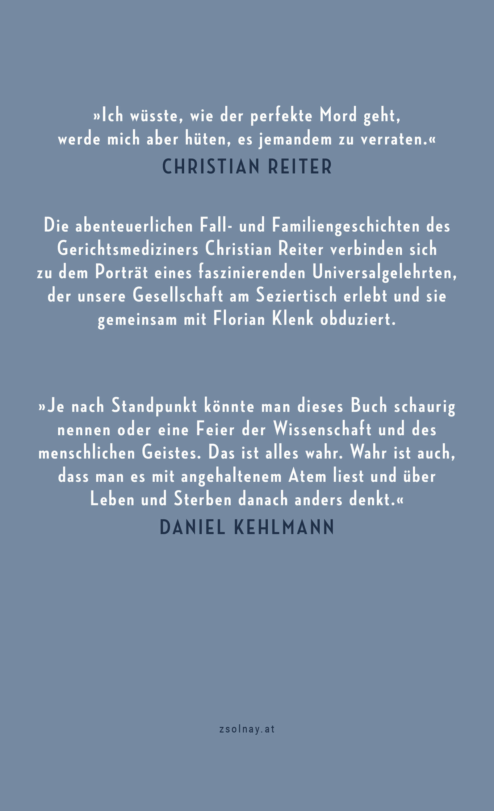 Bestsellerautor Florian Klenk spricht mit dem Gerichtsmediziner Christian Reiter über Leben und Tod. Man liest das Buch mit angehaltenem Atem und denkt über Leben und Sterben danach anders. Daniel Kehlmann Ist der Totenschädel Beethovens tatsächlich der seine?...