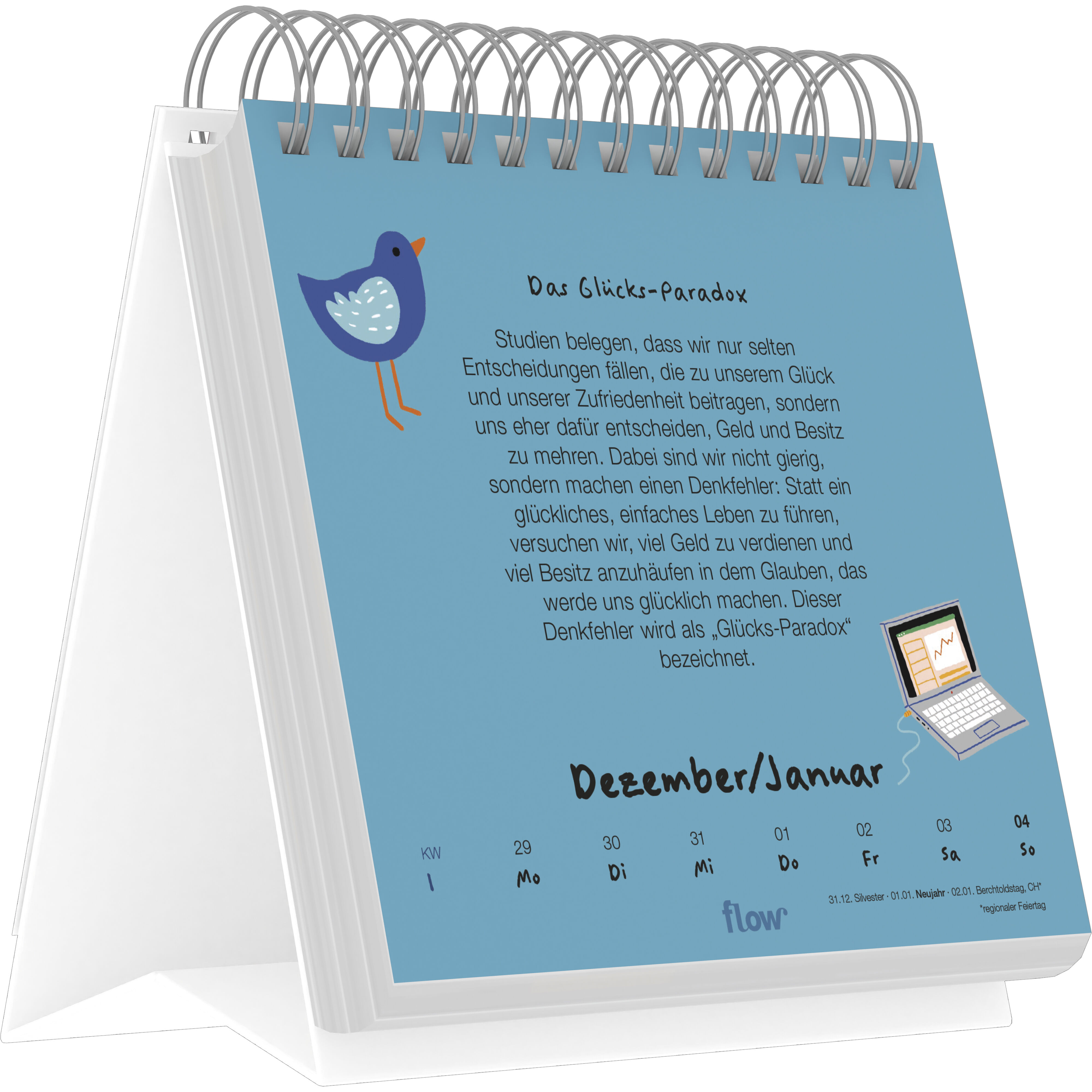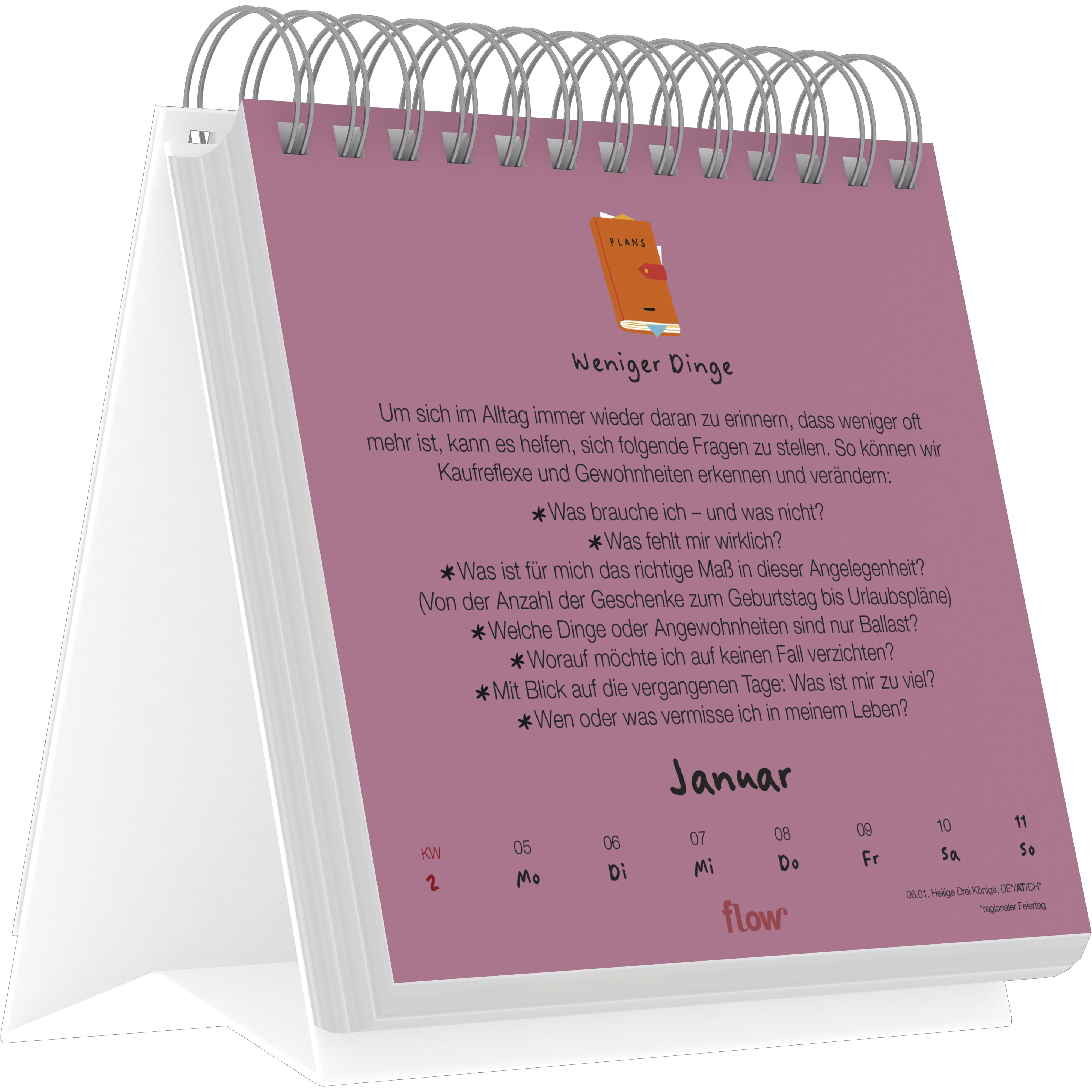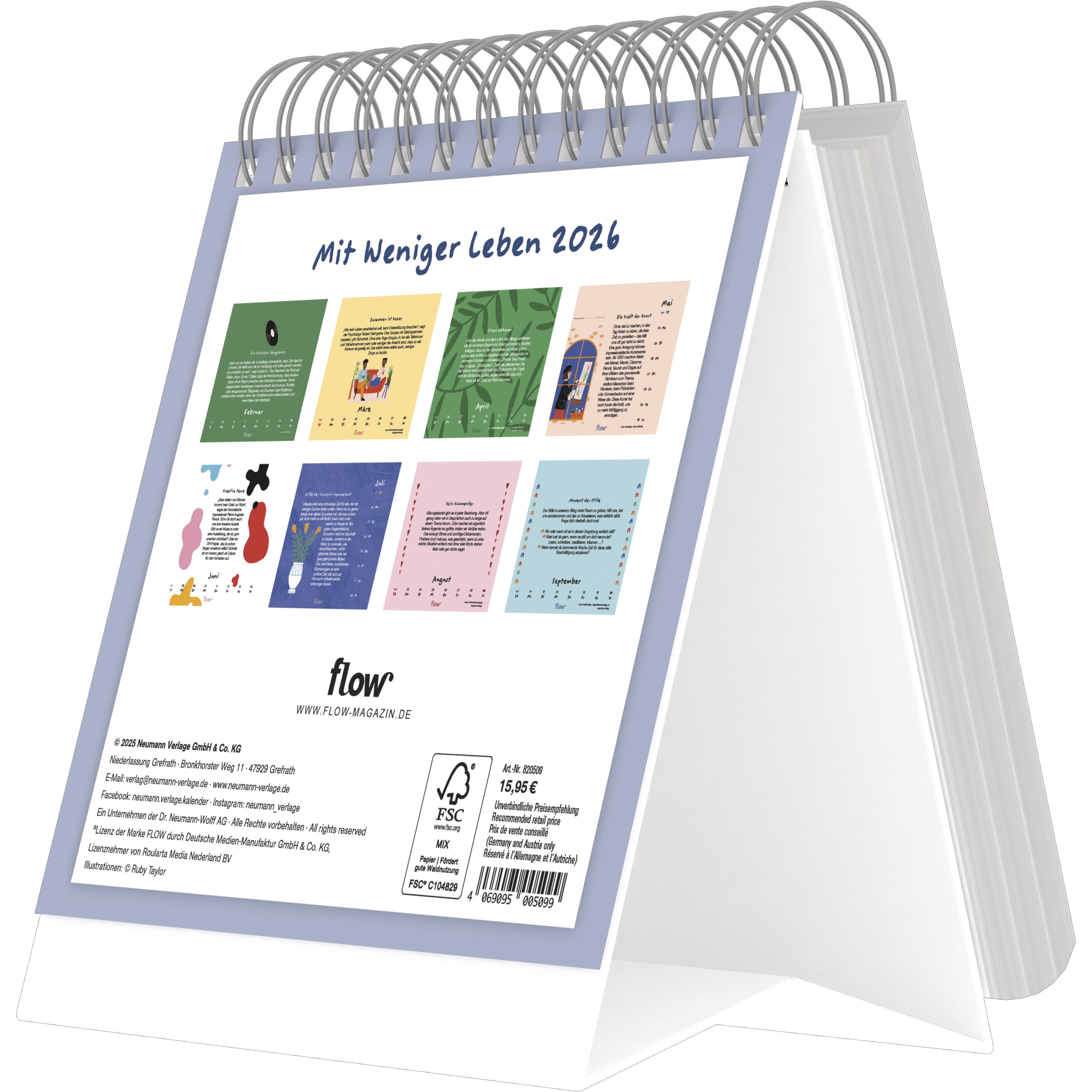 Tischaufstellkalender Mit weniger leben 2026 von Flow im Format 17x16 cm mit 53 Blatt mit Spiralbindung und stabilem Dreiecksfuß. Mit 53 kreativen Illustrationen und Tipps und Tricks wie man mehr Klarheit und Ordnung in sein Leben bringt. Mehr, mehr, mehr Häu...