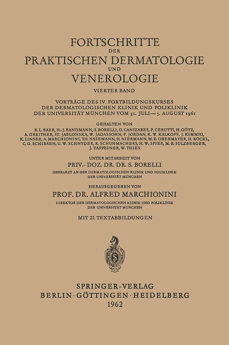 In der ersten Augustwoche des Jahres 1961 fand der IV. Fortbildungs kurs fUr praktische Dermatologie, Venerologie und verwandte Gebiete in der Munchener Dermatologischen Universitats-Klinik statt. Innerhalb einer Woche wurden 30 Vortrage uber aktuelle Probleme...In der ersten Augustwoche des Jahres 1961 fand der IV. Fortbildungs kurs fUr praktische Dermatologie, Venerologie und verwandte Gebiete in der Munchener Dermatologischen Universitats-Klinik statt. Innerhalb einer Woche wurden 30 Vortrage uber aktuelle Probleme und vor allem fUr die Praxis wichtige Themen von Spezialisten der betreffenden Fach gebiete gehalten. Wie fruher schon erweiterten tagliche Diskussionen sowie die Demonstrationen von Krankheitsfallen und histologischen Praparaten die Vortragsserie; sie boten daruber hinaus allen Teilnehmern die Moglichkeit, zur Diagnose und Therapie Fragen zu stellen und Er fahrungen auszutauschen. Obgleich der IV. Kurs nach einem nur 2jahrigen Intervall auf den vor hergehenden des Jahres 1959 folgte, erwies es sich als aktuelles Bedurfnis, zahlreiche weitere Themen hinsichtlich ihres neuesten wissenschaftlichen Standes in relativ breiter Form zu erortern, da die letzten Jahre zahl reiche neue Probleme, Erfahrungen, Erkenntnisse und Forschungsergeb nisse gebracht hatten. Fur die Dermatologie und Venerologie gilt, wie fur alle Gebiete der Wissenschaft, das Wort HERAKLITS "navTa est'. Es sei am Rande vermerkt, daB der IV. Kurs 10 Jahre nach dem 1. folgte. Aller dings ist hierin keine Absicht zu erblicken; vielmehr verhinderte der fur das nachste Jahr geplante XII. Internationale KongreB in Washington, diesen Fortbildungskurs im Jahre 1962 abzuhalten. - Ais Teilnehmer vereinigten sich mehr als 300 Facharzte aus Afghanistan, Argentinien, Belgien, Deutschland, Finnland, Griechenland, Holland, Italien, Jugo slawien, Norwegen, Osterreich, Polen, Schweden, der Schweiz, Spanien und den USA. Diese internationale Beteiligung kennzeichnet deutlich das Interesse an derartigen Fortbildungs-Tagen.
