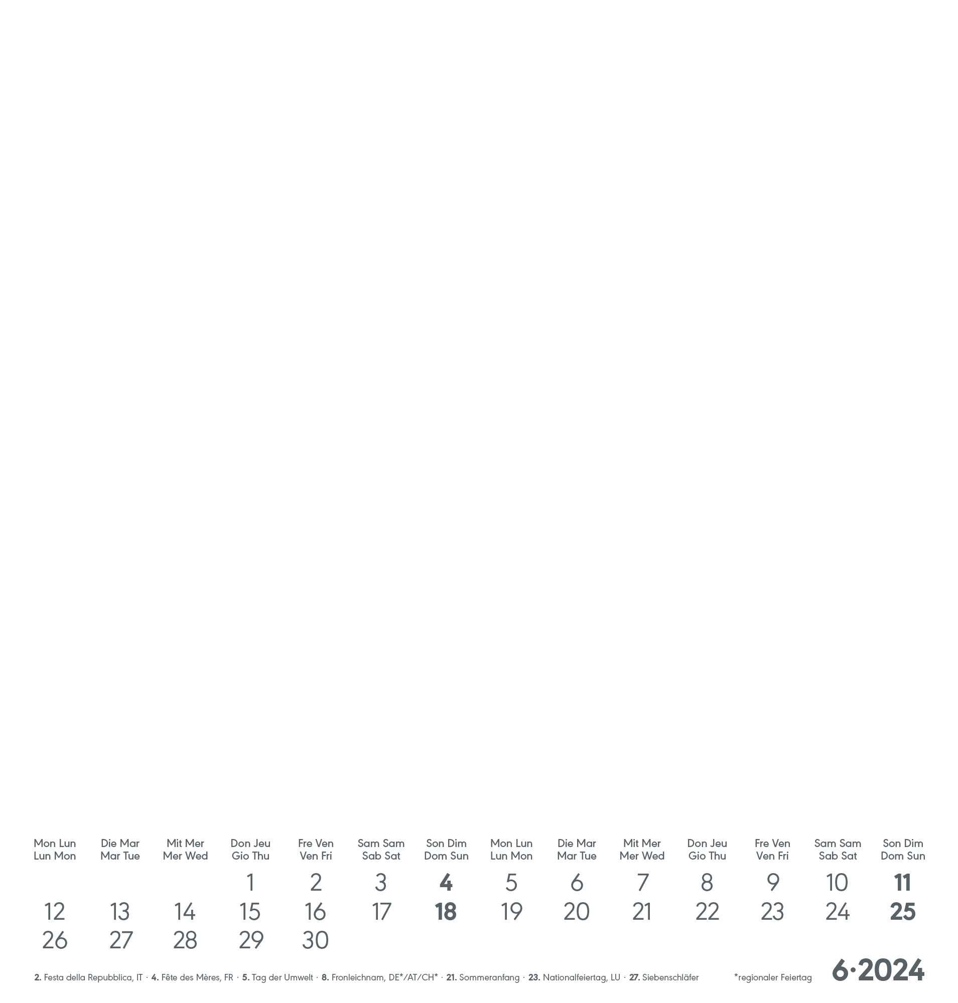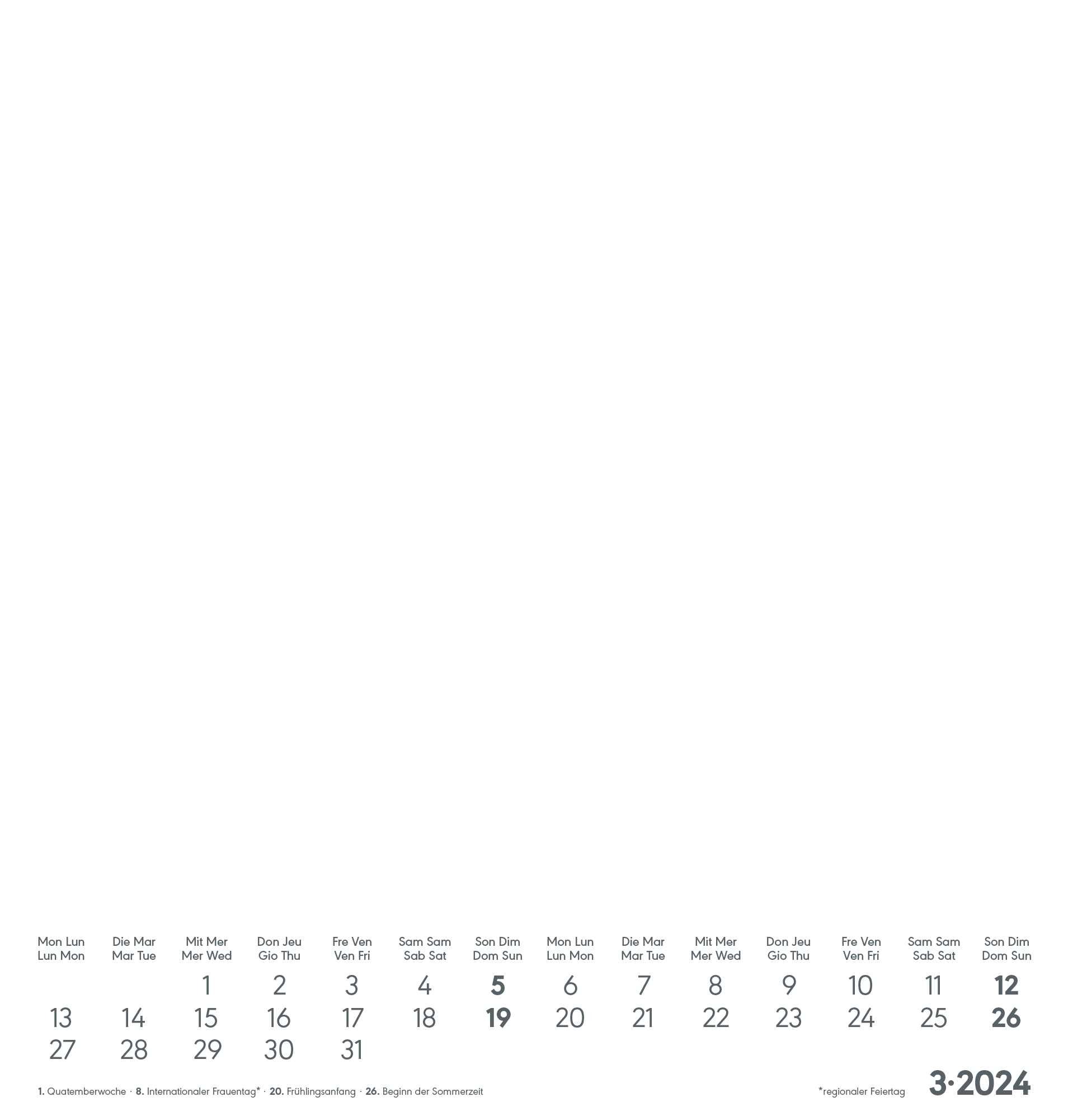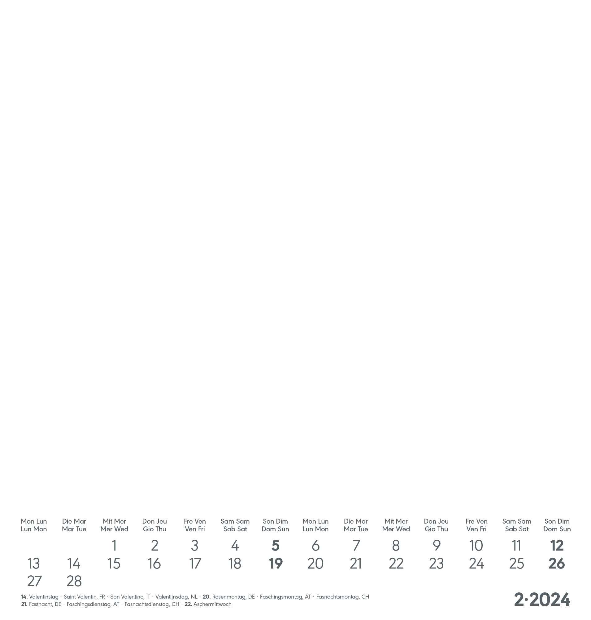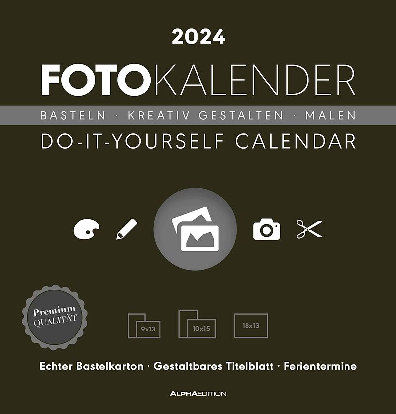 Hochwertiger Bastelkalender, gedruckt auf Papier aus nachhaltiger Forstwirtschaft Hergestellt in Deutschland FSC-zertifiziert Maße: 21 x 22 cm Gestaltbares Titelblatt Weiße Schrift auf schwarzem Hintergrund Praktische Spiralbindung 4-sprachiges Kalendarium (DE...