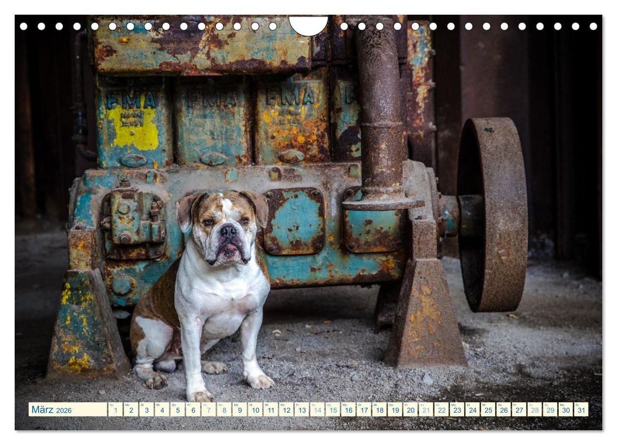 Kuschelige Vierbeiner vor industrieller Kulisse fotografiert. Old English Bulldogs treffen auf Industriekultur. Ausdrucksvolle Fotos von Rassehunden vor beeindruckender Kulisse.