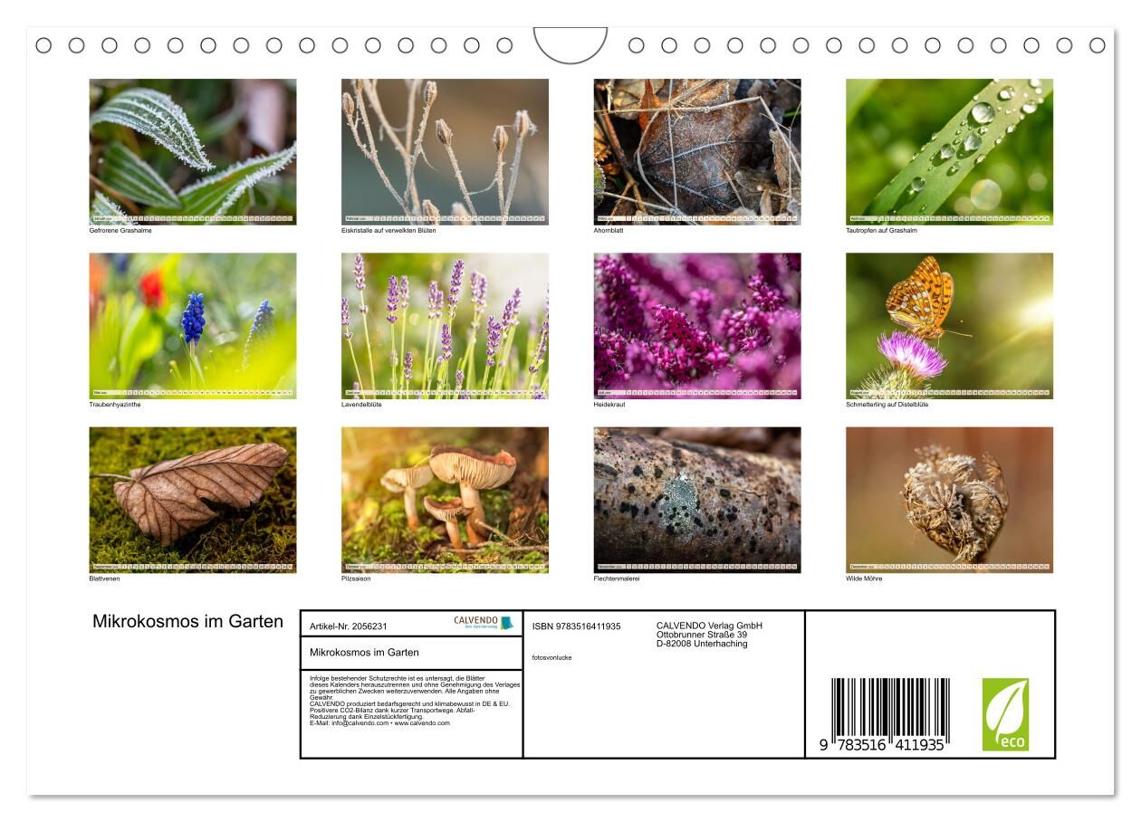 Im Garten verbergen sich unzählige Details, die dem bloßen Auge oft entgehen: filigrane Blattadern, funkelnde Tautropfen, Eiskristalle oder die raue Oberfläche von Baumrinde. Dieser Kalender richtet den Blick auf das Kleine, das Unscheinbare und offenbart dabe...
