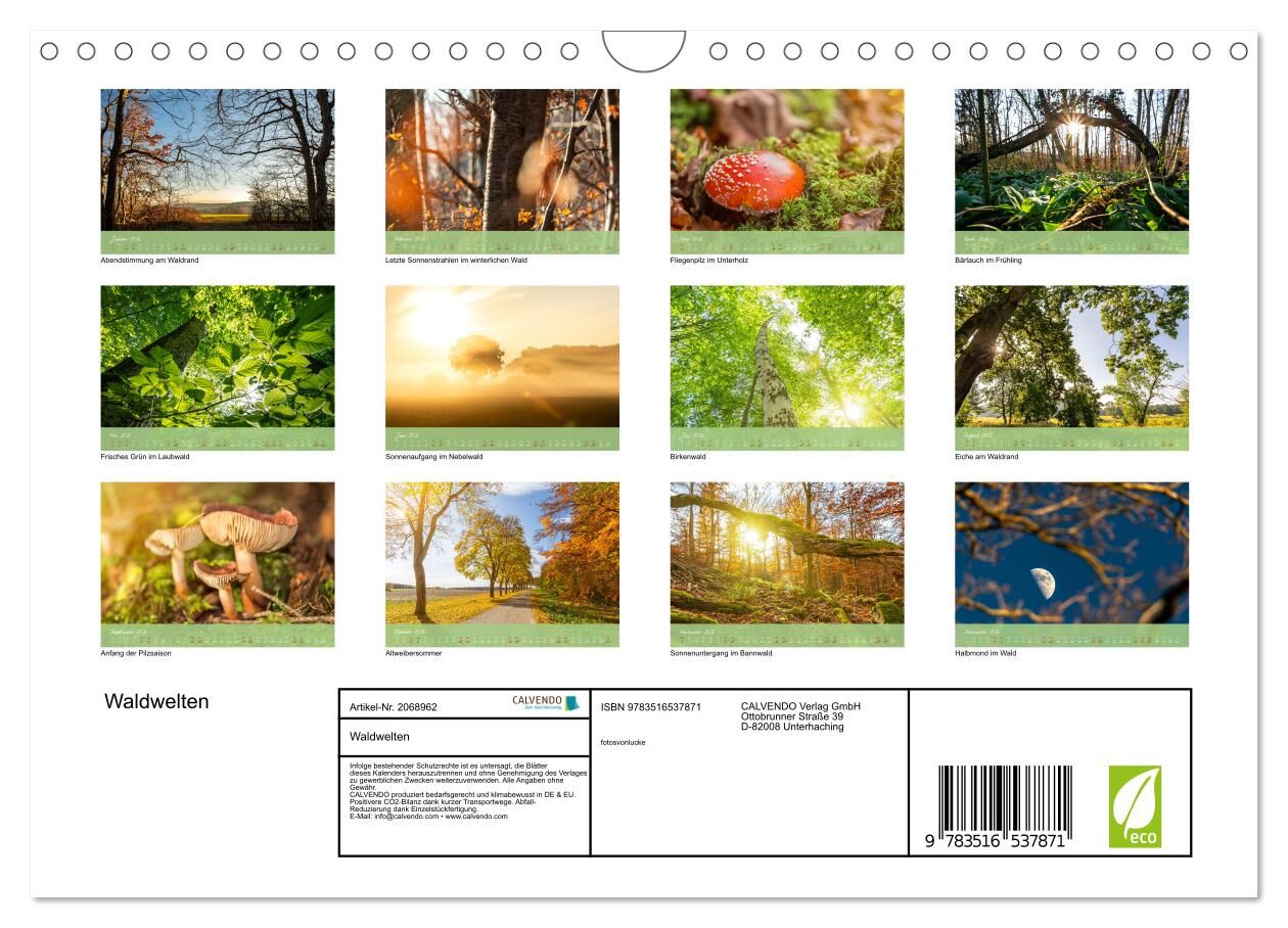 Der Kalender Waldwelten nimmt Sie mit auf eine visuelle Reise durch die faszinierende Vielfalt deutscher Wälder. Monat für Monat zeigen eindrucksvolle Fotografien die Schönheit heimischer Baumlandschaften von moosbedeckten Waldböden über lichtdurchflutete Pfad...