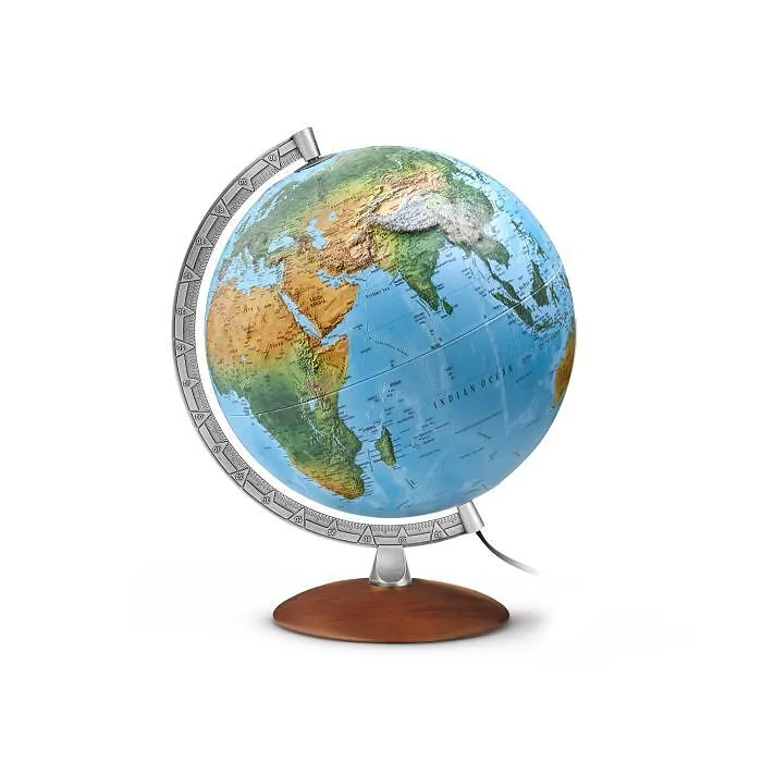 FR 3010 Doppelbild physisch/politisch, Leuchtglobus mit fühlbarer 3-D-Oberfläche, dunkelbrauner Echtholzfuß, skalierter silberfarbener Metall-Meridian, schwarzes Kabel mit Schnurschalter 1,50 Länge, Gesamthöhe 40 cm, Text in deutscher Sprache (Auf Anfrage in e...