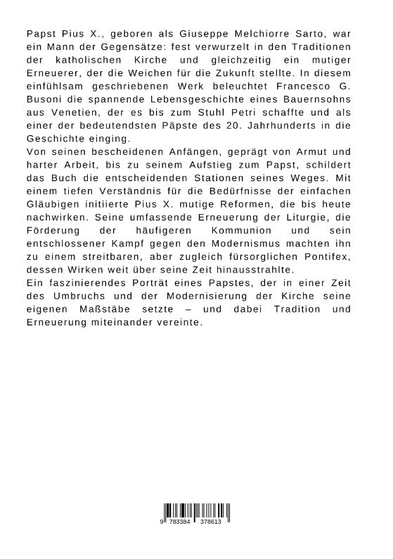Papst Pius X., geboren als Giuseppe Melchiorre Sarto, war ein Mann der Gegensätze: fest verwurzelt in den Traditionen der katholischen Kirche und gleichzeitig ein mutiger Erneuerer, der die Weichen für die Zukunft stellte. In diesem einfühlsam geschriebenen We...