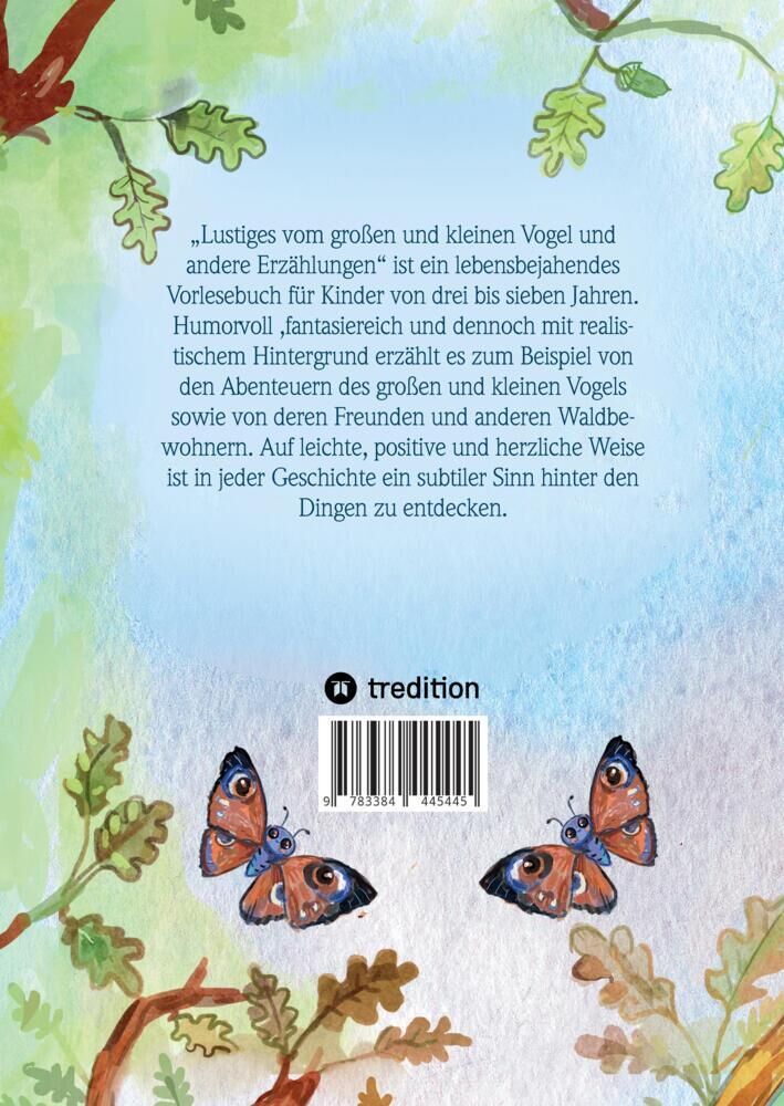 Lustiges vom kleinen und vom großen Vogel ist ein lebensbejahendes Vorlesebuch für Kinder im Alter von 47 Jahren. Humorvoll ,fantasiereich und dennoch mit realem Bezug zu dem Leben der Kinder erzählt es zum Beispiel von den Abenteuern des kleinen und des große...