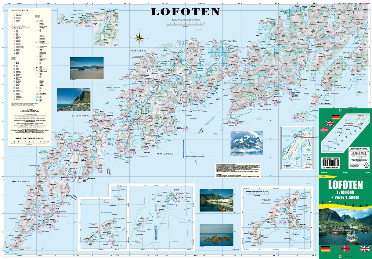Detaillierte touristische topographische Wanderkarte der Lofoten. Mit umfassenden touristischen Signaturen. GPS-tauglich. Mit Detailkarte der Insel Værøy 1:50.000