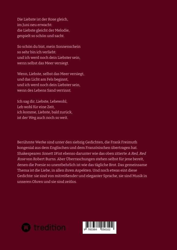 Siebzig Gedichte rund um die Liebe, aus dem Englischen und Französischen kongenial übersetzt. Neben berühmten Werken enthält das Buch auch echte Fundstücke. Gemeinsam haben die Gedichte, dass sie in mitreißender und eleganter Sprache abgefasst sind, dass sie k...