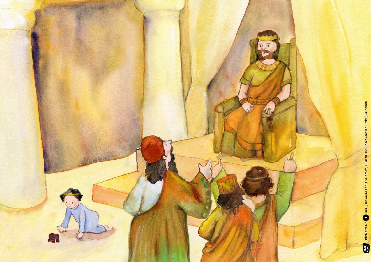 Eines Tages fordern zwei streitende Frauen ein Urteil von König Salomo. Wie soll der weise König herausfinden, welche Frau recht hat und welche Frau lügt? Was ist Gerechtigkeit? Mit dem Kamishibai dem salomonischen Urteil auf der Spur Streit und Streitschlicht...