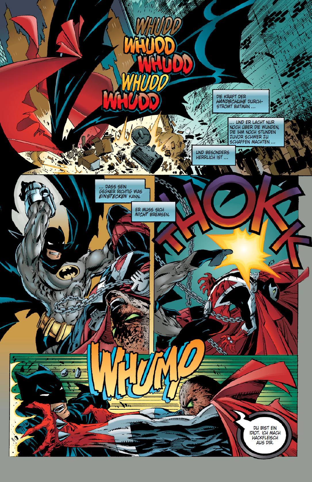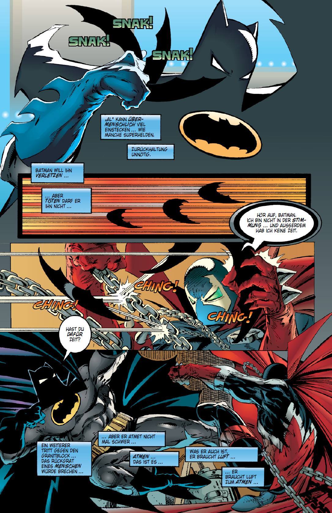 In New York trifft Batman auf Spawn wo die anfänglich erbitterten Widersacher schließlich zähneknirschend gemeinsame Sache machen um den finsteren Plan, der Unterjochung der Menschheit durch Roboter, zu vereiteln. DAS LEGENDÄRE ERSTE AUFEINANDERTREFFEN VON BAT...