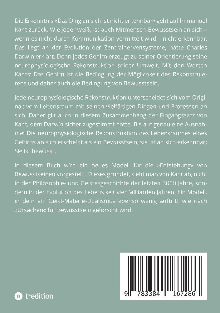 Die Erkenntnis »Das Ding an sich ist nicht erkennbar« geht auf Immanuel Kant zurück. Wie jeder weiß, ist auch Mitmensch-Bewusstsein an sich wenn es nicht durch Kommunikation vermittelt wird nicht erkennbar. Das liegt an der Evolution der Zentralnervensysteme, ...
