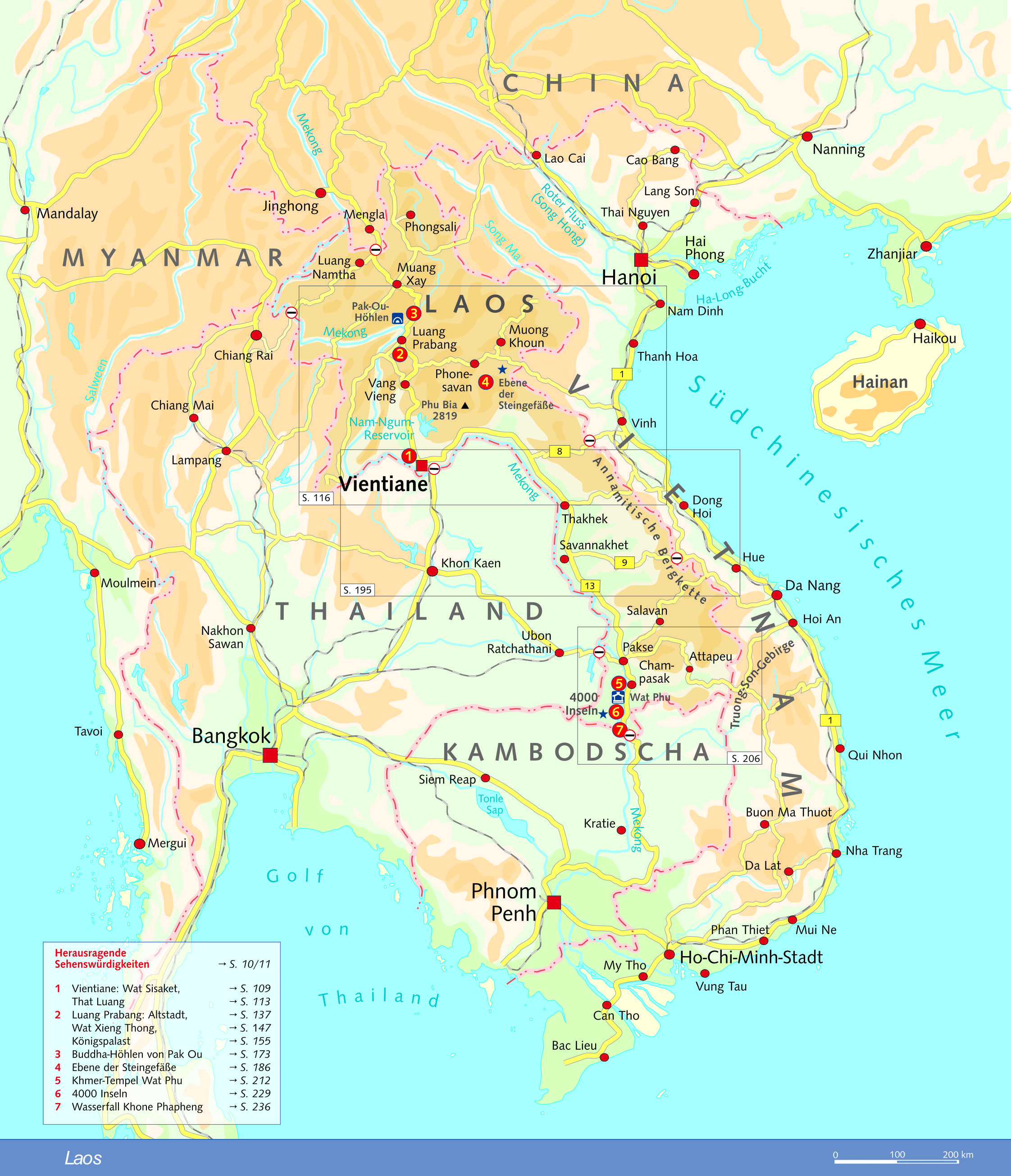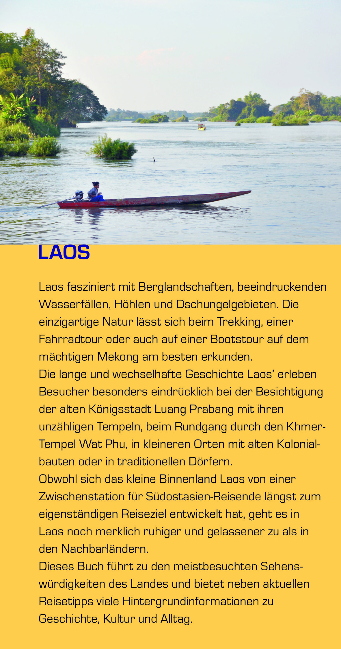 Franz-Josef Krücker, geb. 1954, studierte Sozialwissenschaften und Anglistik in Köln und war danach Redakteur und Chef vom Dienst der Fachzeitschrift >das neue ChinaVietnamKambodschaLaosdas neue ChinaVietnamKambodschaLaos Seite 20 RELIGIÖSE KUNSTWERKE IN DER HAUPTSTADT VIENTIANE Das Museum Ho Pha Keo > Seite 110 FLUSSLANDSCHAFT, KARSTBERGE UND OUTDOOR-SPAß Vang Vieng > Seite 126 CHARMANTE KÖNIGSSTADT Welterbestätte Luang Prabang > Seite 136 PILGERZIEL UND MYSTISCHER ORT Die Pak-Ou-Höhlen > Seite 173 RÄTSELHAFTE BEHÄLTNISSE Die Ebene der Steingefäße > Seite 186 KHMER-TEMPELRUINE UND UNESCO-WELTERBE Wat Phu > Seite 212 FRUCHTBARE HOCHEBENE Das Bolaven-Plateau > 225 PALMEN, WASSERFÄLLE UND EINE ALTE EISENBAHN Die 4000 Inseln im Mekong > Seite 229 Laos fasziniert mit Berglandschaften, beeindruckenden Wasserfällen, Höhlen und Dschungelgebieten. Die einzigartige Natur lässt sich beim Trekking, einer Fahrradtour oder auch auf einer Bootstour auf dem mächtigen Mekong am besten erkunden. Die lange und wechselhafte Geschichte Laos' erleben Besucher besonders eindrücklich bei der Besichtigung der alten Königsstadt Luang Prabang mit ihren unzähligen Tempeln, beim Rundgang durch den Khmer-Tempel Wat Phu, in kleineren Orten mit alten Kolonialbauten oder in traditionellen Dörfern. Obwohl sich das kleine Binnenland Laos von einer Zwischenstation für Südostasien-Reisende längst zum eigenständigen Reiseziel entwickelt hat, geht es in Laos noch merklich ruhiger und gelassener zu als in den Nachbarländern. Dieses Buch führt zu den meistbesuchten Sehenswürdigkeiten des Landes und bietet neben aktuellen Reisetipps viele Hintergrundinformationen zu Geschichte, Kultur und Alltag. >>> Weitere Reiseführer zu Südostasien finden Sie auf www.trescher-verlag.de