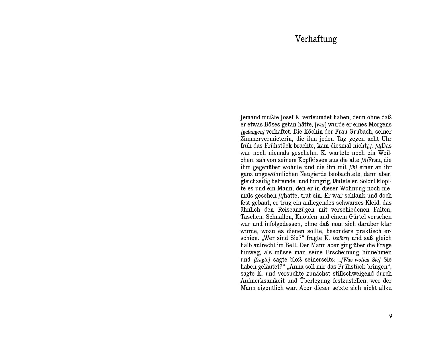 Franz Kafkas (18831924) unvollendeter Roman Der Prozeß liegt nun zum ersten Mal in einer vollständigen Leseausgabe vor, die nicht nur die bereits bekannten und mehrfach publizierten Texte beinhaltet, sondern auch die von Kafka gestrichenen Stellen wiedergibt. ...