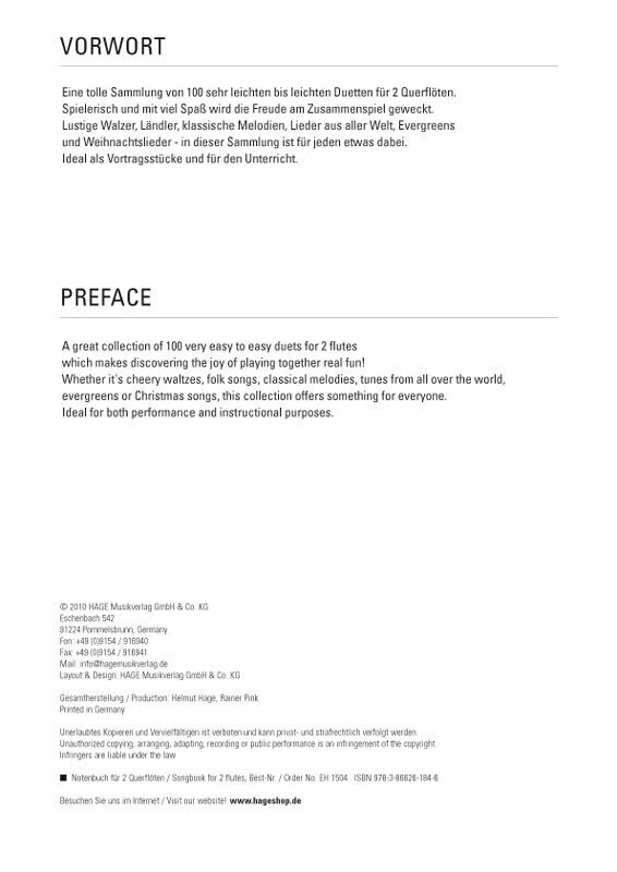 Eine tolle Sammlung von 100 sehr leichten bis leichten Duetten für 2 Querflöten. Eine tolle Sammlung von 100 sehr leichten bis leichten Duetten für 2 Querflöten. Spielerisch und mit viel Spaß wird die Freude am Zusammenspiel geweckt. Lustige Walzer, Ländler, k...
