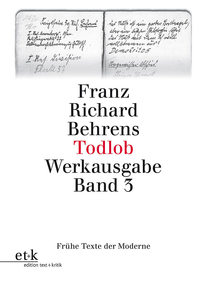 Franz Richard Behrens wurde 1895 bei Halle geboren und wuchs in Berlin und Essen auf. 1914 schloss er ein Studium am Lehrerseminar in Hattingen ab. Während seiner Zeit als Frontsoldat im Ersten Weltkrieg publizierte Behrens in der Berliner Kunstzeitschrift "De...Franz Richard Behrens wurde 1895 bei Halle geboren und wuchs in Berlin und Essen auf. 1914 schloss er ein Studium am Lehrerseminar in Hattingen ab. Während seiner Zeit als Frontsoldat im Ersten Weltkrieg publizierte Behrens in der Berliner Kunstzeitschrift "Der Sturm" erste expressionistische Gedichte. 1917 erschien sein einziger Gedichtband "Blutblüte". Nach Kriegsende schrieb er das (verschollene) Filmskript zum Sensationsfilm "Die Autofahrt unter der Erde" und weitere Drehbücher und Filmerzählungen. 1923-35 war Behrens Lokalredakteur für Film, Theater, Sport und Schallplatten der Berliner Tageszeitung "Der Deutsche". Nach deren Auflösung durch Joseph Goebbels zog er sich in die "innere Emigration" zurück. Von 1945 bis zum Mauerbau 1961 schrieb er für die Westberliner Tageszeitung "Der Abend" eine wöchentliche Sportkolumne. 1977 starb Franz Richard Behrens völlig verarmt in Ostberlin. Der von Michael Lentz herausgegebene Band "Todlob" enthält über einhundert frühe Gedichte und Entwürfe, die zum größten Teil noch unveröffentlicht sind. Das in einem Nachlass überraschend aufgefundene, an der Ostfront 1915/16 verfasste Tagebuch nur aus Gedichten kann als komplementäre "Übersetzung" der von Behrens im "Feldtagebuch" zur selben Zeit dokumentarisch notierten konkreten Kriegserfahrungen gelesen werden: "es ist nicht minder eine chronologische Mitschrift, allerdings eine komprimierte, metamorphorisierte, die die disso-ziierenden Kriegssensationen mit Wortsensationen kontert" (Michael Lentz).