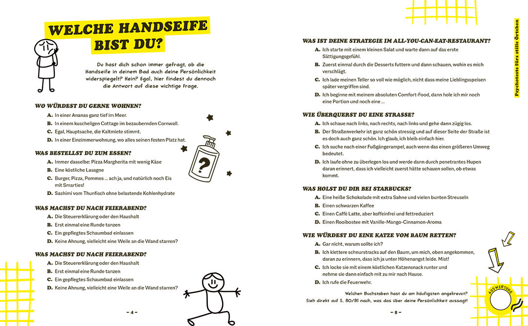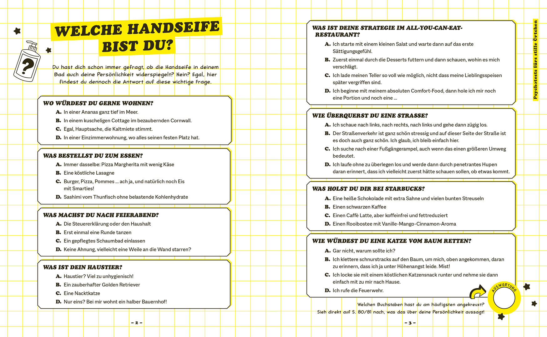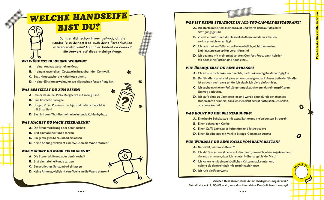 Psychotests für die gewissen 5 Minuten: Welche Handseife wärst du? Was tust du, wenn dein Handy ins Klo fällt? Entdecke die kurzweiligsten Psychotests, die dir in nur wenigen Minuten spannende und lustige Erkenntnisse über deine Persönlichkeit liefern! Welche...