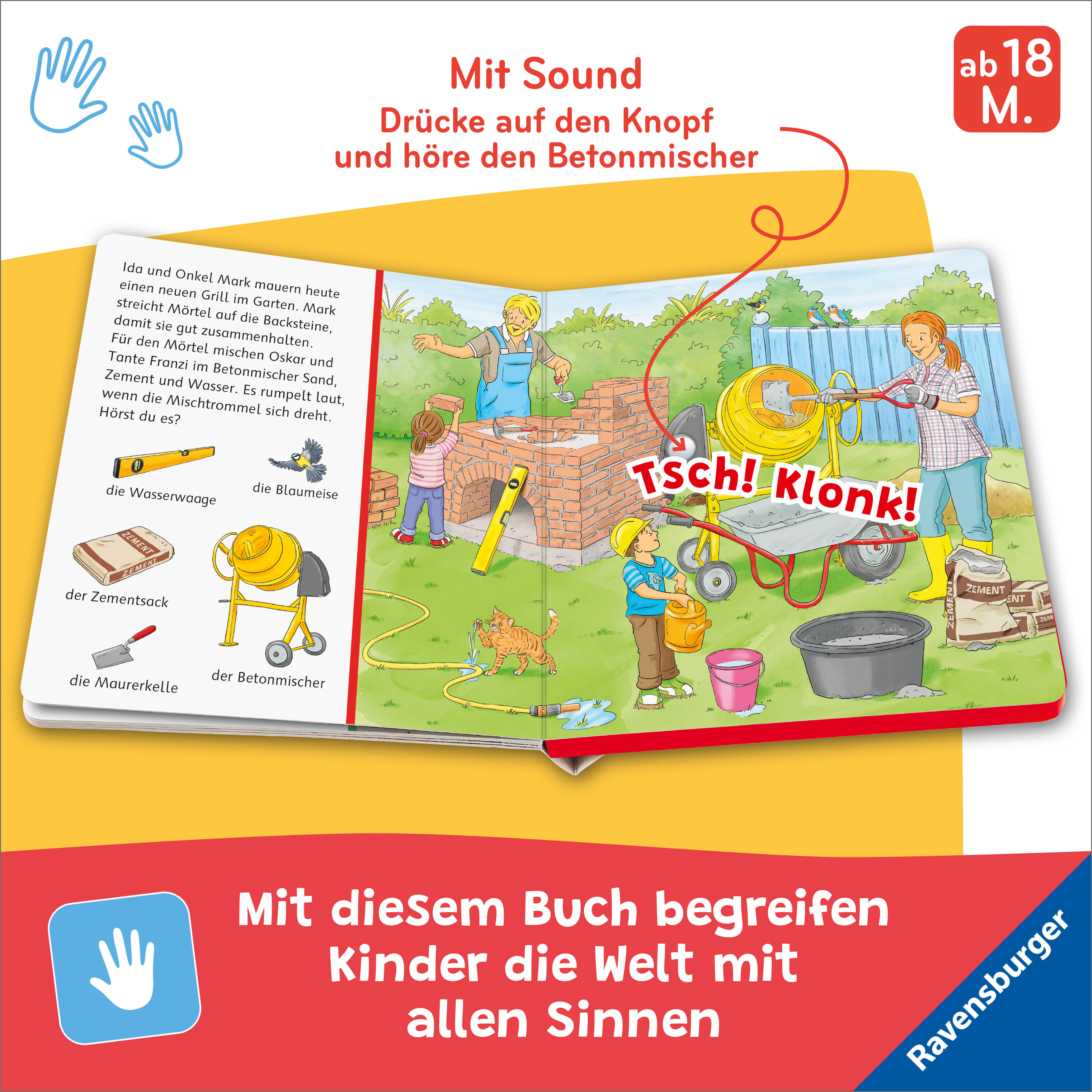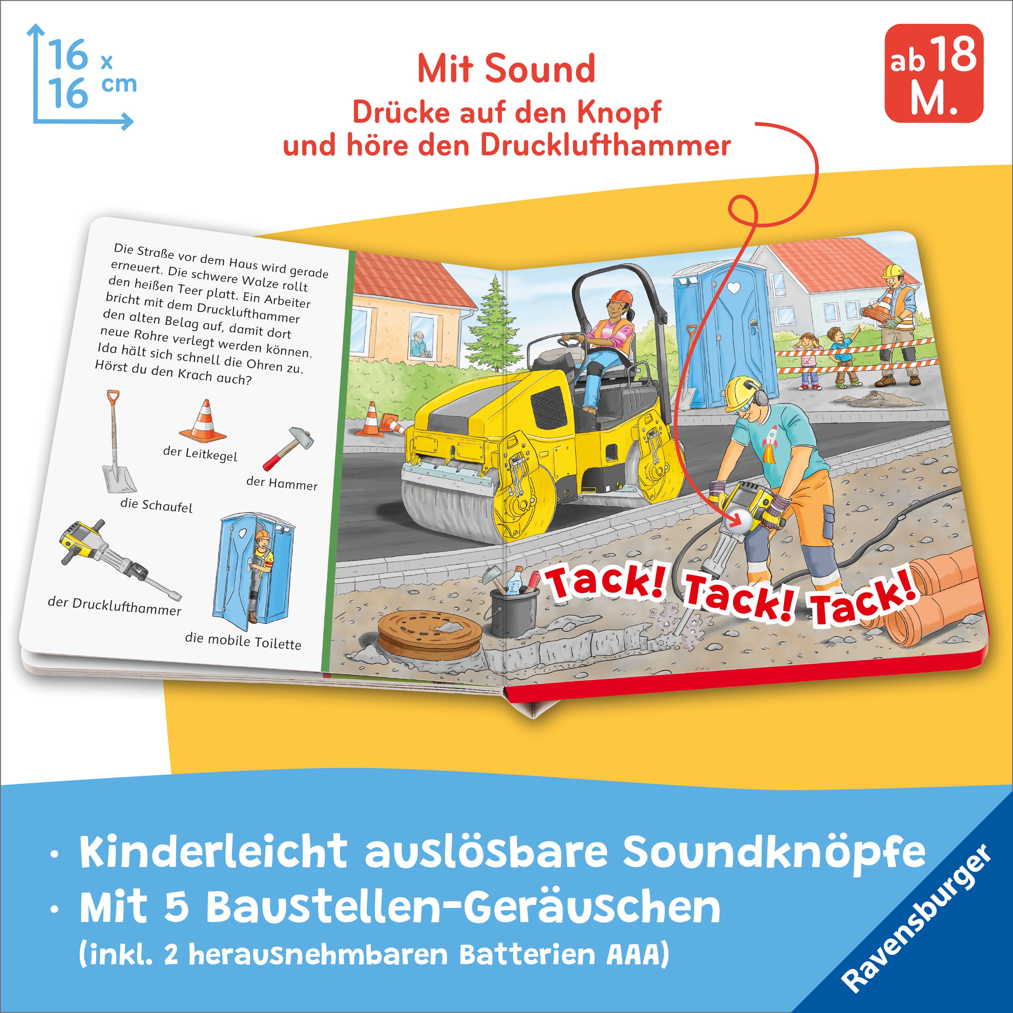 Das beliebte "Sachen suchen" kombiniert mit 5 spannenden Sounds Sägen, Bohren, Hämmern: Auf der Baustelle gibt es viele interessante Geräusche. Wie laut rumpelt es, wenn sich die Mischtrommel des Betonmischers dreht? Einfach leicht auf den Knopf drücken, schon...