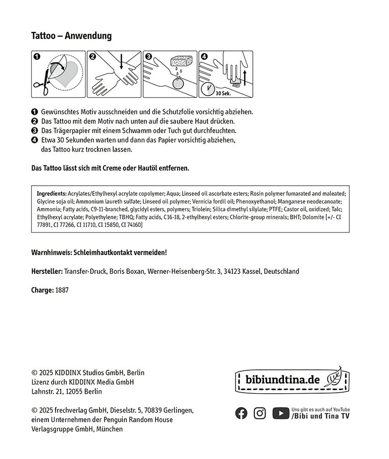 Entdecke über 200 Tattoos mit Motiven rund um die Welt von Bibi & Tina! Total verhexter Tattoospaß: Die zahlreichen Tattoos mit Motiven aus der Welt von Bibi & Tina sind leicht aufzutragen und verschwinden nach einer Weile wieder von selbst wie weggeh...