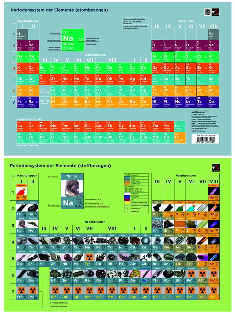 Das Periodensystem der Elemente ist konsequent in Stoff- und Teilchenebene getrennt. Es wird als Falttafel im Format 18,5 x 25,0 cm (aufgeklappt 37,0 x 25,0 cm) auf stabilen Karton gedruckt und ist beidseitig laminiert.
