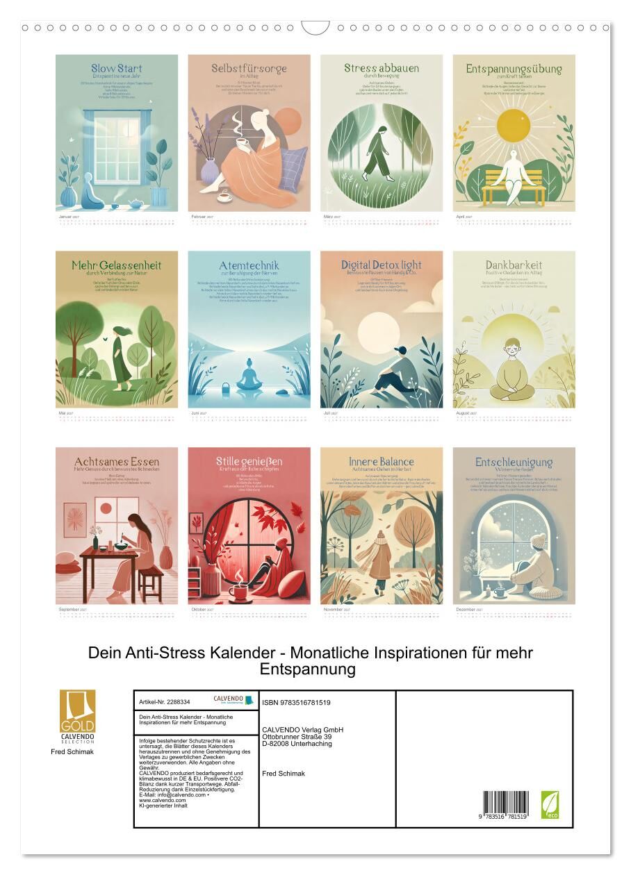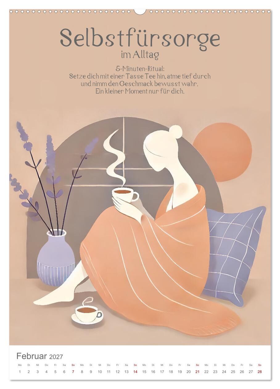 Fühlst du dich oft gehetzt und sehnst dich nach mehr Ruhe im Alltag? Dieser Kalender begleitet dich Monat für Monat mit inspirierenden Achtsamkeitsübungen und beruhigenden Illustrationen, die dich zum Innehalten einladen. Jeden Monat ein neues Self-Care-Thema....