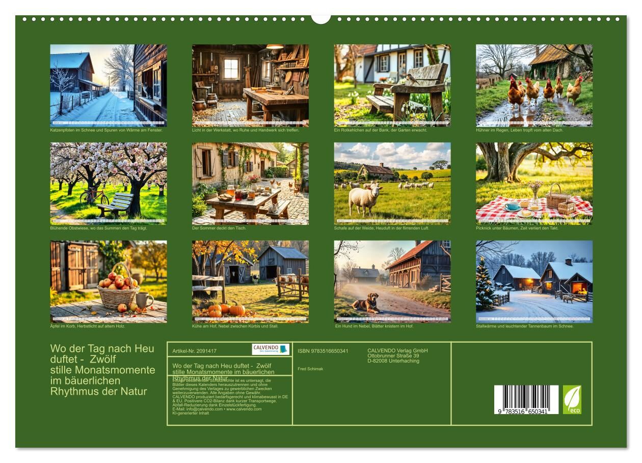 Ein Kalender voller Ruhe, Handwerk und Natur. Die zwölf KI generierten Motive zeigen das idyllische Landleben in seiner ganzen Vielfalt. Mit Werkstätten, Obstwiesen, Picknicks und verschneiten Höfen. In fotorealistischer Ästhetik und mit viel Liebe zum Detail ...